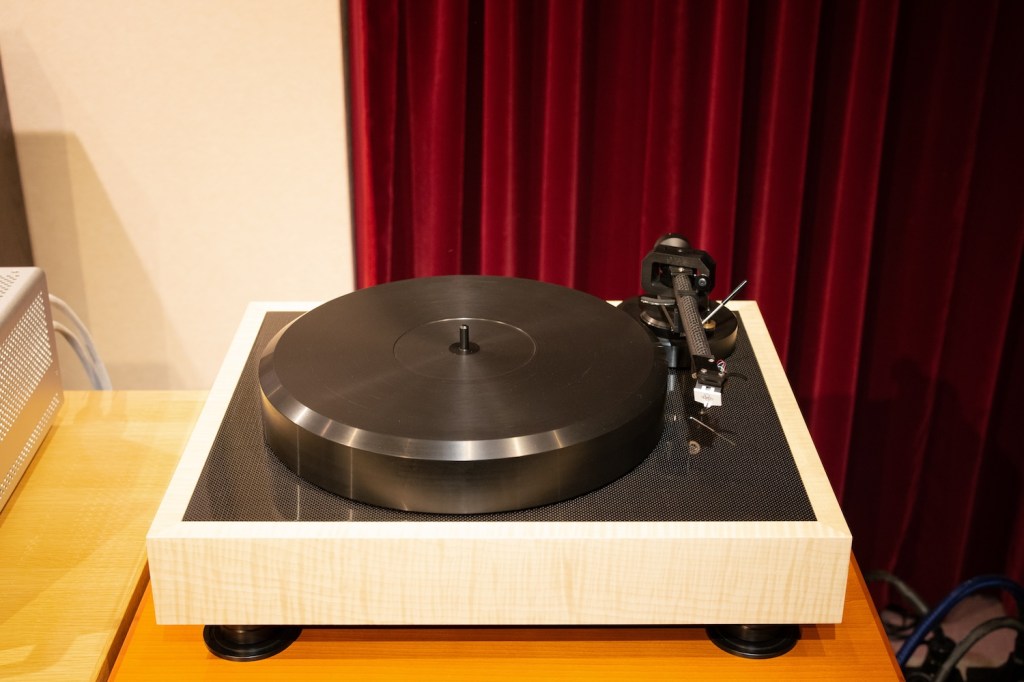 写真はメイプル、カーボントップはオプション(¥50,000)となり、キャビネットグロス仕上げも可能でこちらもオプション(¥70,000)でのご紹介となります。製品外観からは何か特別な仕組みであることの匂いを感じさせないシンプルなデザイン、オーソドックスなプレーヤーの佇まい。メイプルを見てしまったからか、ブラックアッシュで黒一色という仕上げも個人的には興味があります。