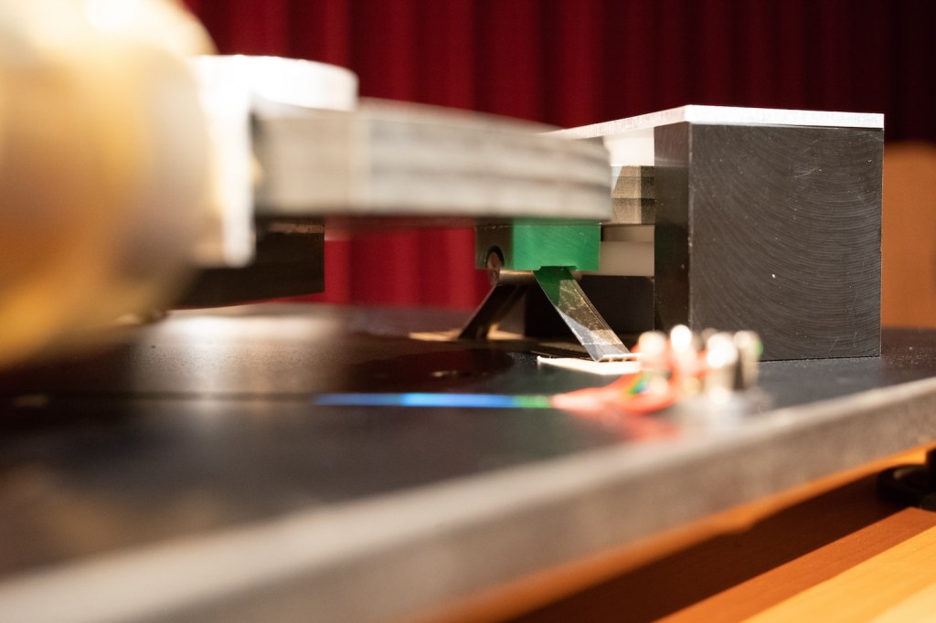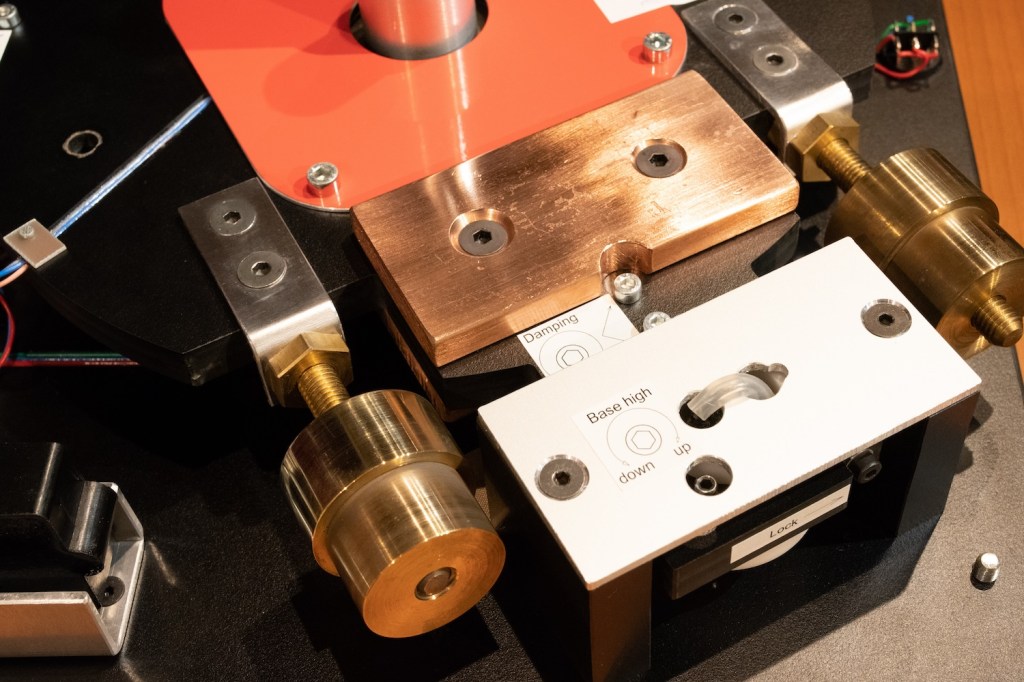 さらにサブシャーシの水平を保つためのカウンターウェイト(写真の黄銅製の箇所)で調整できる仕組みもあり、組み合わせるトーンアームによって変化するバランスにも細かく対応できるようになっています。これはSMEやortofonなど多彩なトーンアームに対応できるための仕様になり、使う側の選択肢の幅が広がる楽しみのひとつ。5.6kgと重量のあるプラッターはダイレクトドライブでしっかりとハンドリングされますが、初速はトルクを低く設定し振動を和らげる設定があるのは先日の Brinkmann と同様のものですね、定速まではおよそ10秒。重量プラッターのプレーヤーと思いきや、これをサブシャーシでフローティングさせるという機構、やはり見た目のシンプルさには決して見えない手の込んだつくりになっています。これら一連の内部機構を見ていくだけでも作り手のレコード再生への経験値と熱を感じてきます、またそれらをキャビネットで全て隠すニクい演出も◎。