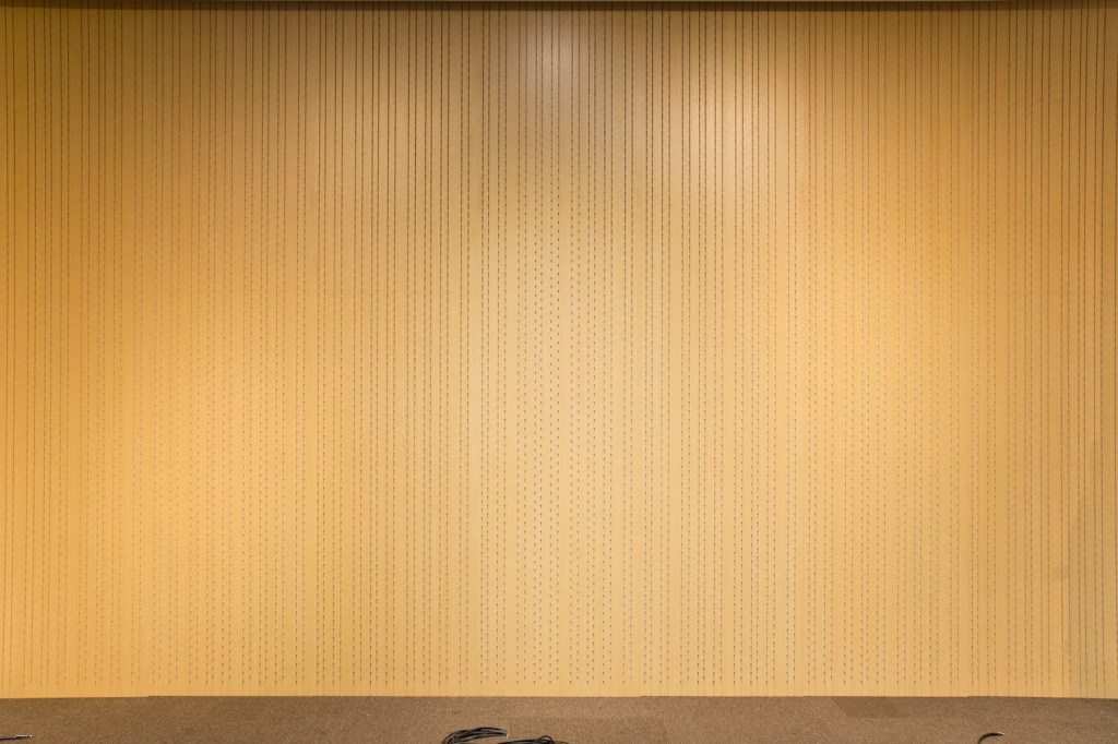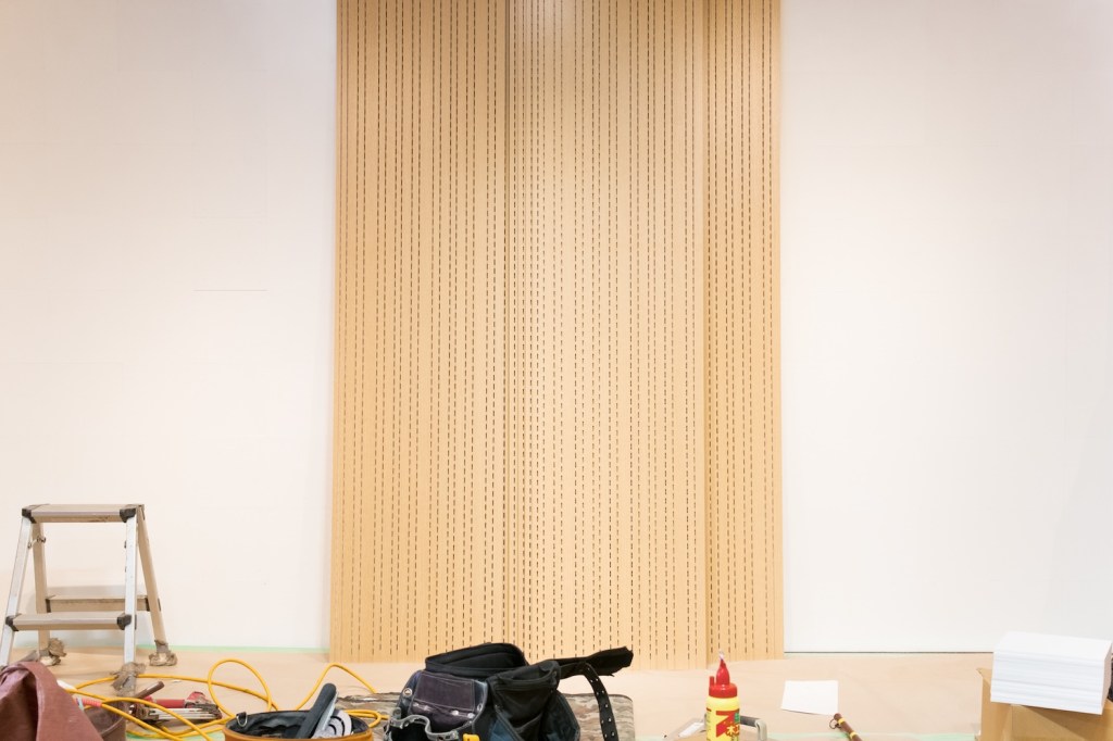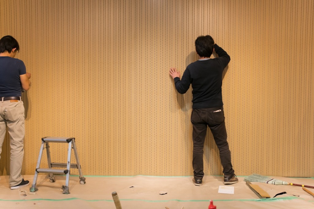 Vento Wall Panel は吸音と拡散をバランスよく行える音響パネル。写真では分かりにくいですが中央に立てかけて準備しているのが高密度MDFに天然木の突き板仕上げ、前面にはスリット、背面に丸孔が施してあり計算された拡散効果を生み出す優れた仕上げになっている音響パネル、更にこの画像での壁にはすでに施行済状態ですが、吸音となるフェルトが壁一面に張り付いた状態です。吸音効果のフェルトと拡散効果の木のパネルが重なる事で Vento Wall Panel は完成し効果の全てが揃う事になります。