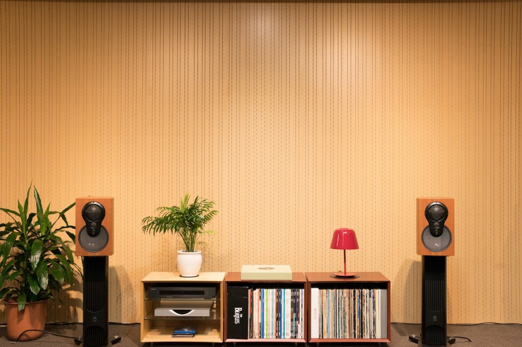 リスニングポジションで聴いていると本当にシンプルな壁に見えるのですが、これだけの効果を感じるとやはり不思議になってパネルにグッと近づいてみたり、そうするとスリットの細かさや背面に覗き見える丸孔の施し方など、計算された細工の細かさに見惚れてしまうようです。