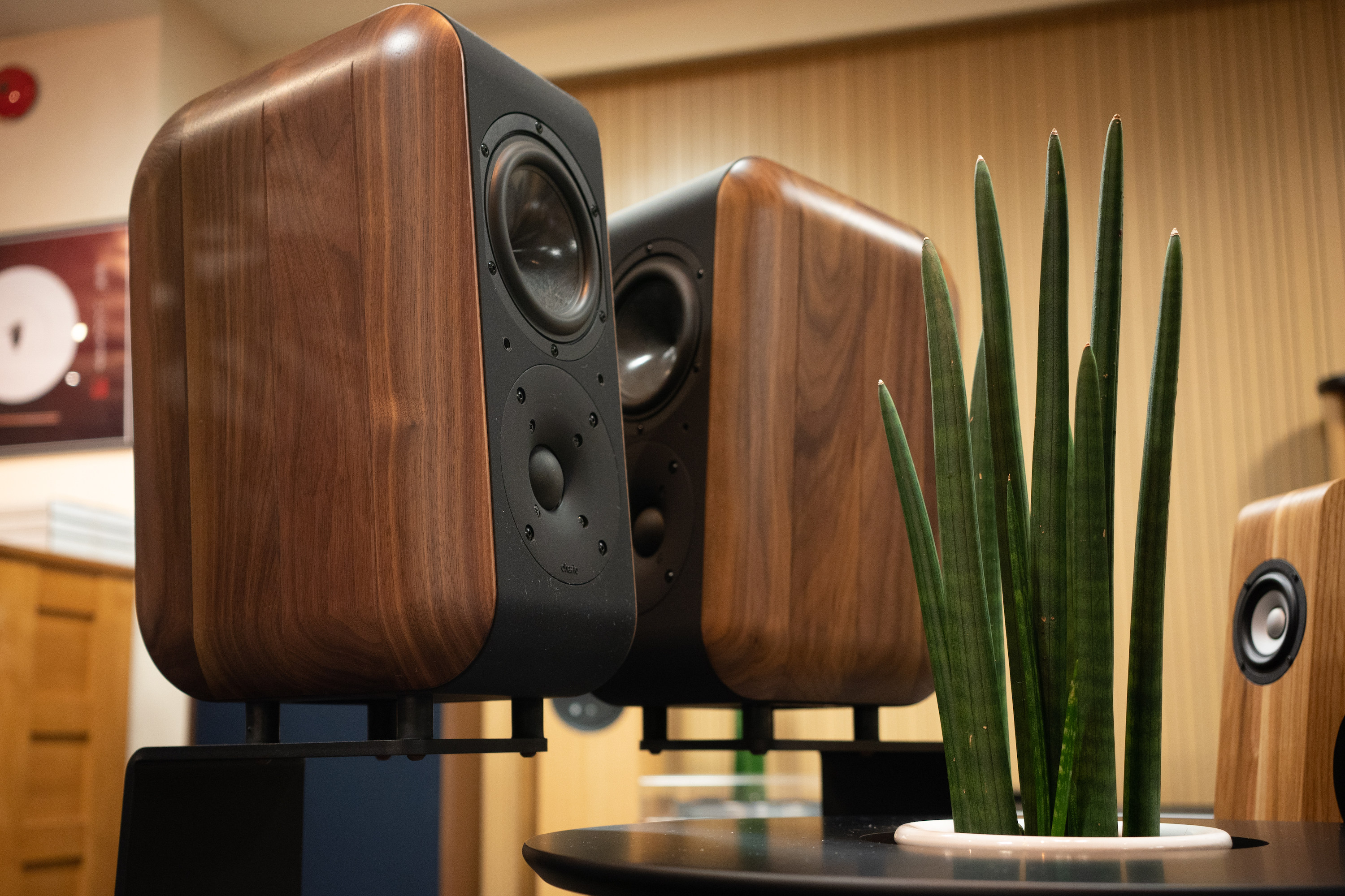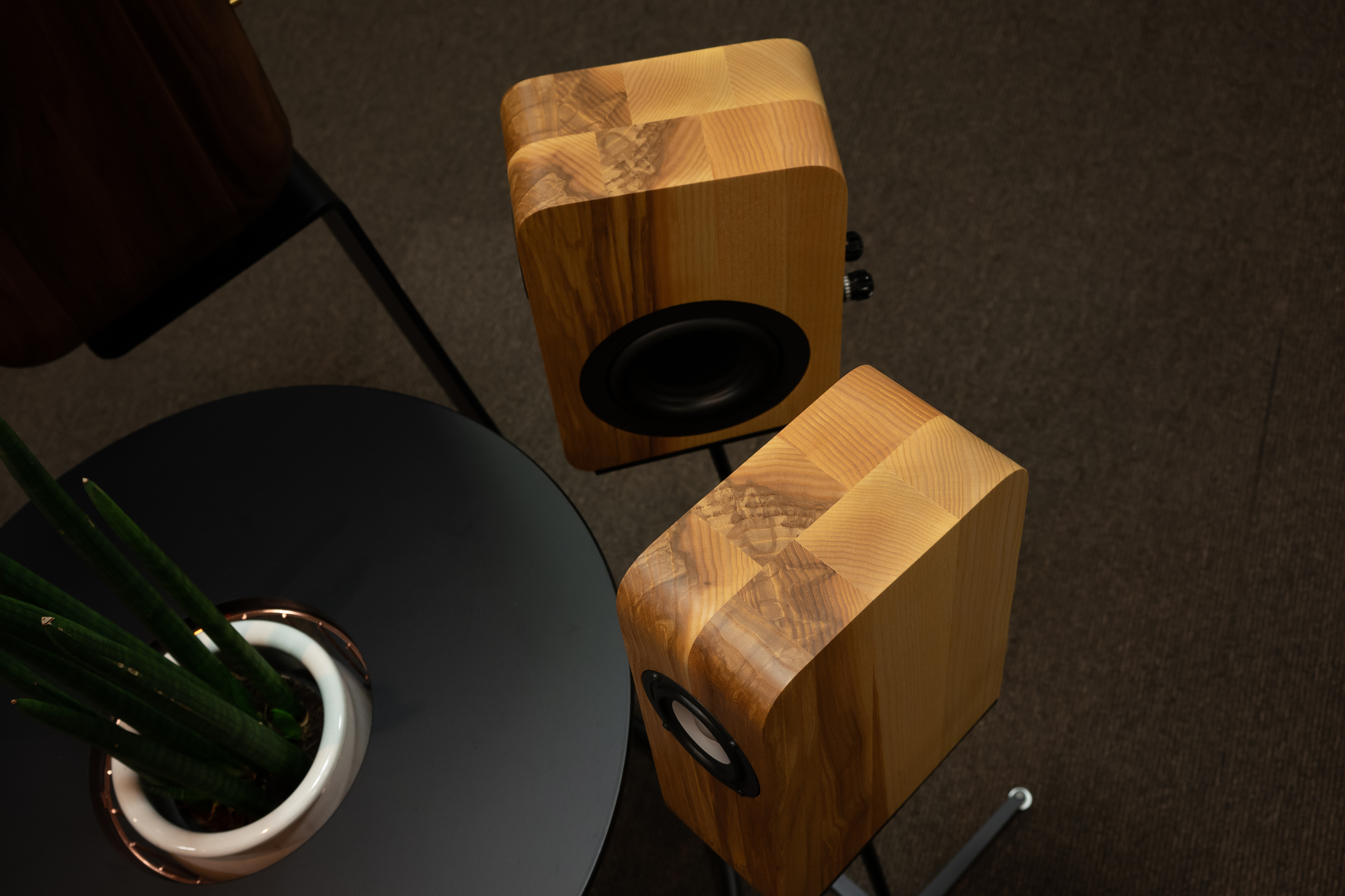 また、ブックシェルフスピーカーはスタンドと合わせたプロダクトデザインも魅力的です。展示している4機種はどれもその条件を満たしているもので、呼び名の通り本体だけを限られたスペースに設置することも可能ですが、専用スタンドとの組み合わせで完成するサウンドパフォーマンスの向上と合わせてその佇まいにも更に個性が発揮されます。このサイズだから仕上げる事ができたデザインがあり、それらの多くは木のキャビネットと鉄のスタンドという異素材で完成する美しさがあります。今回の2機種はどちらもキャビネットに天然木を使用する拘りがあり、扱いの難しく歩留まりの悪い材料をあえて選択していますがそれは音響面からの音質の確保が最優先であると同時に仕上げの美しさや個性の存在があり、全く同じ仕上がりの物を量産する目的とは正反対の作り手の意図が反映されています。存在自体が優れた工芸品でもあり、音で時間を操る道具としても一級品。