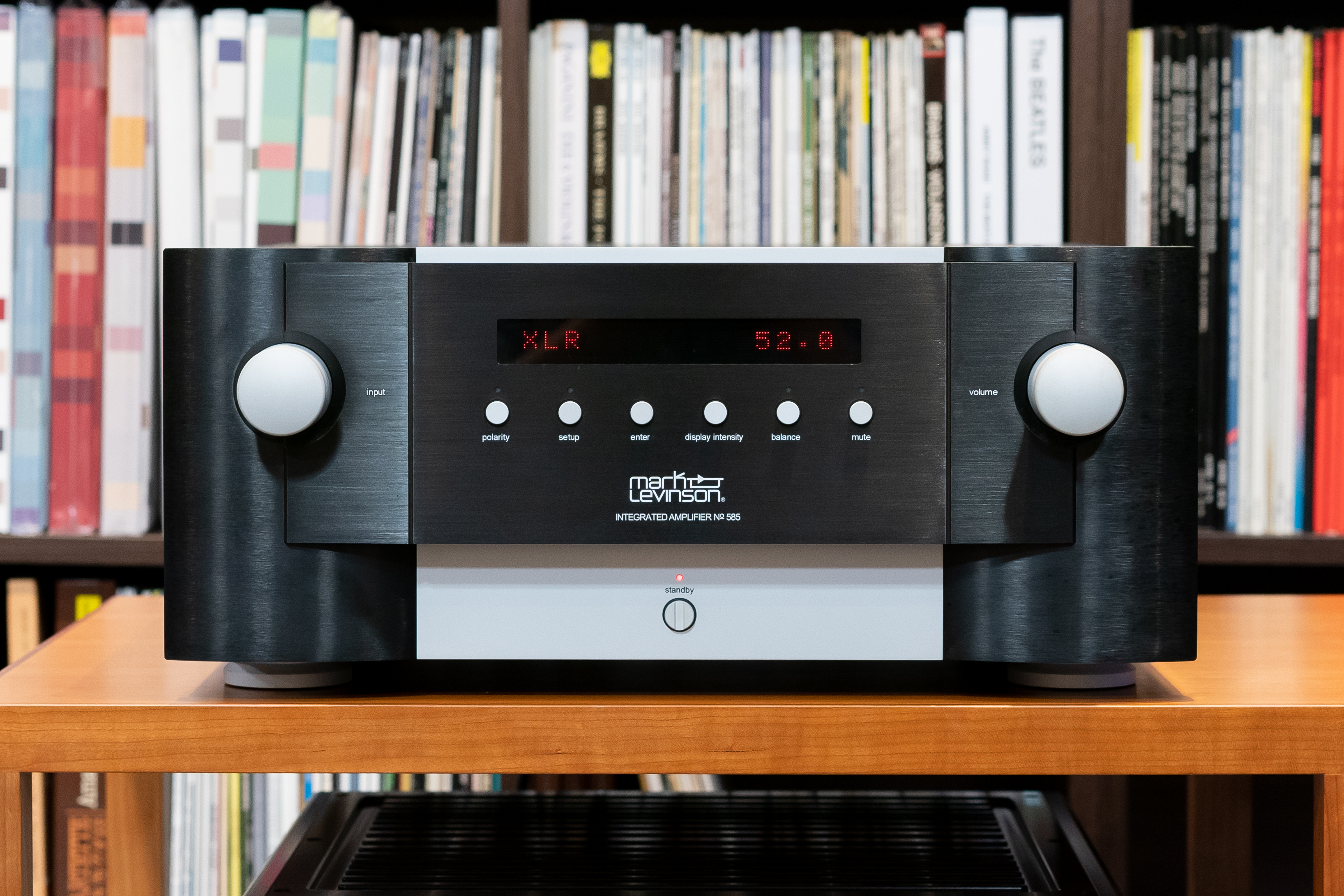 Mark Levinson プリメインアンプ、No585 フロアー展示品をお得なプライスでご紹介致します。アナログとデジタル信号を電源回路とアイショレーションしヒートシンクまで内部構造に取り入れている為、外観のデザインはヒートシンク特有の尖ったものが見えません。アナログからデジタル入力まで装備し、USBはDSD128ネイティブ再生まで可能です。現在はフォノイコライザー内蔵の No585.5 と併売されている状況となりますが(フォノ以外の内部回路は同一)、最終的には No585 は完了となります。フォノイコライザーは外部単品としてご用意される予定の方にはこちらの No585 の方が回路がシンプルになり内部環境から見ても音質的に有利です。200W/ch(8Ω)のハイパワーですので、大型スピーカーがこの一台で楽々とドライブできる感触は爽快の一言です。