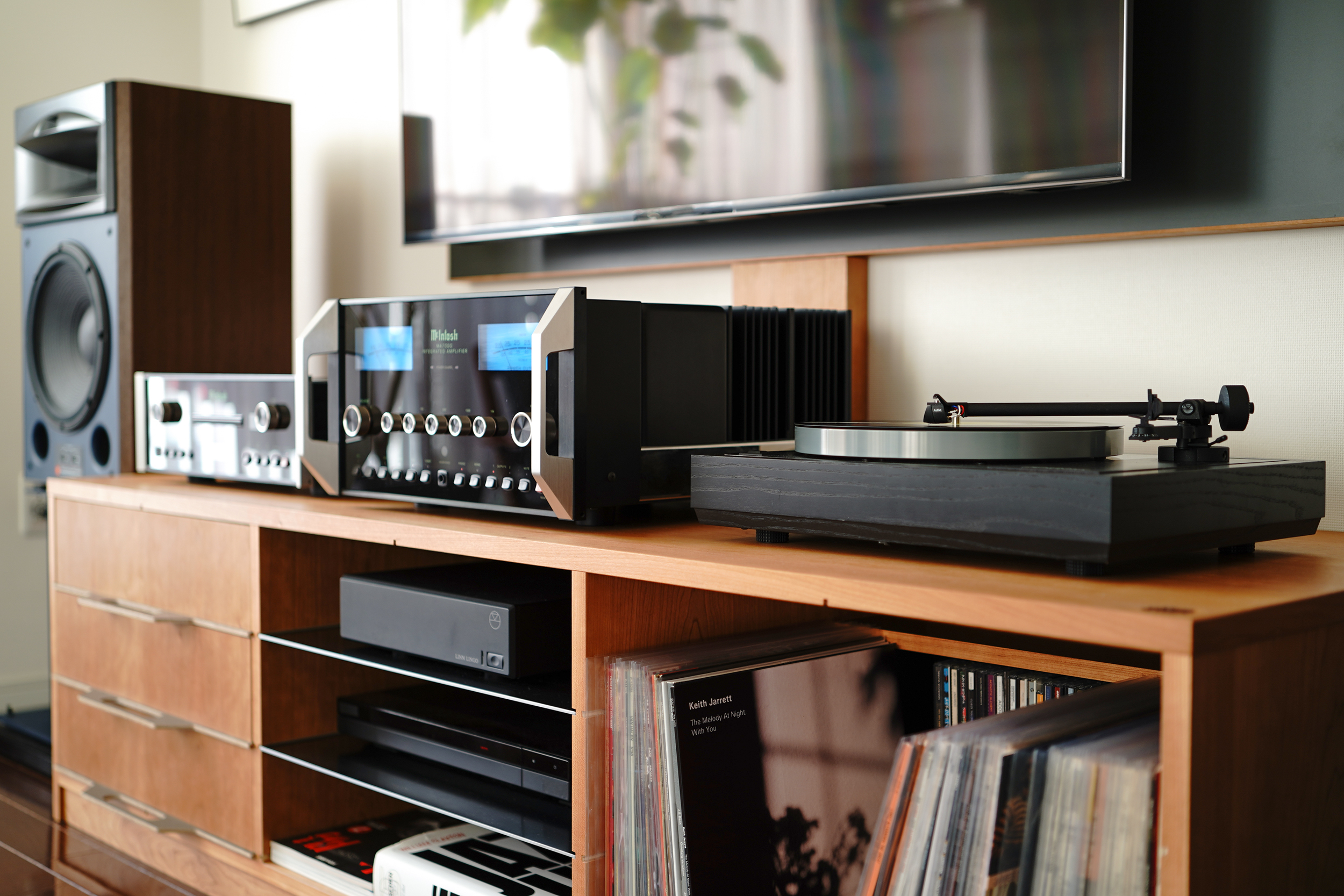 窓から入る光が気持ちの良い時間のお部屋、テーブルに椅子、ソファーに緑もそれぞれがすっきりと整理されたとても素敵な空間でした。レコードプレーヤー、LP12 の導入を検討頂いてフロアーにお越し頂いたのが昨年秋頃でしたでしょうか。お届けする少し前からレコード盤はすでに手元に準備が進んでいた様子で、そうなると本体選びが楽しくて仕方ないと思います。この機会にオーディオ機器を設置するラックもご自身で特注され準備されました、ラックの納品を待ちながら選んで頂いたブラックの LP12 をしっかり調整していよいよお届けとなりました。特注ラックは強度もあり Mclntosh の重量でも全く心配ありません、CDやレコードの収納もあり音楽を聴く為のラックとしてとっても素敵な仕上がり。こちらのラック、BEAMS RECORDS の店舗でレコードラックとして実際に使用されているのを見て気に入り、製作されている工房へも行かれたそうです。ブラックの LP12 、ここに収まると更に似合いますね。