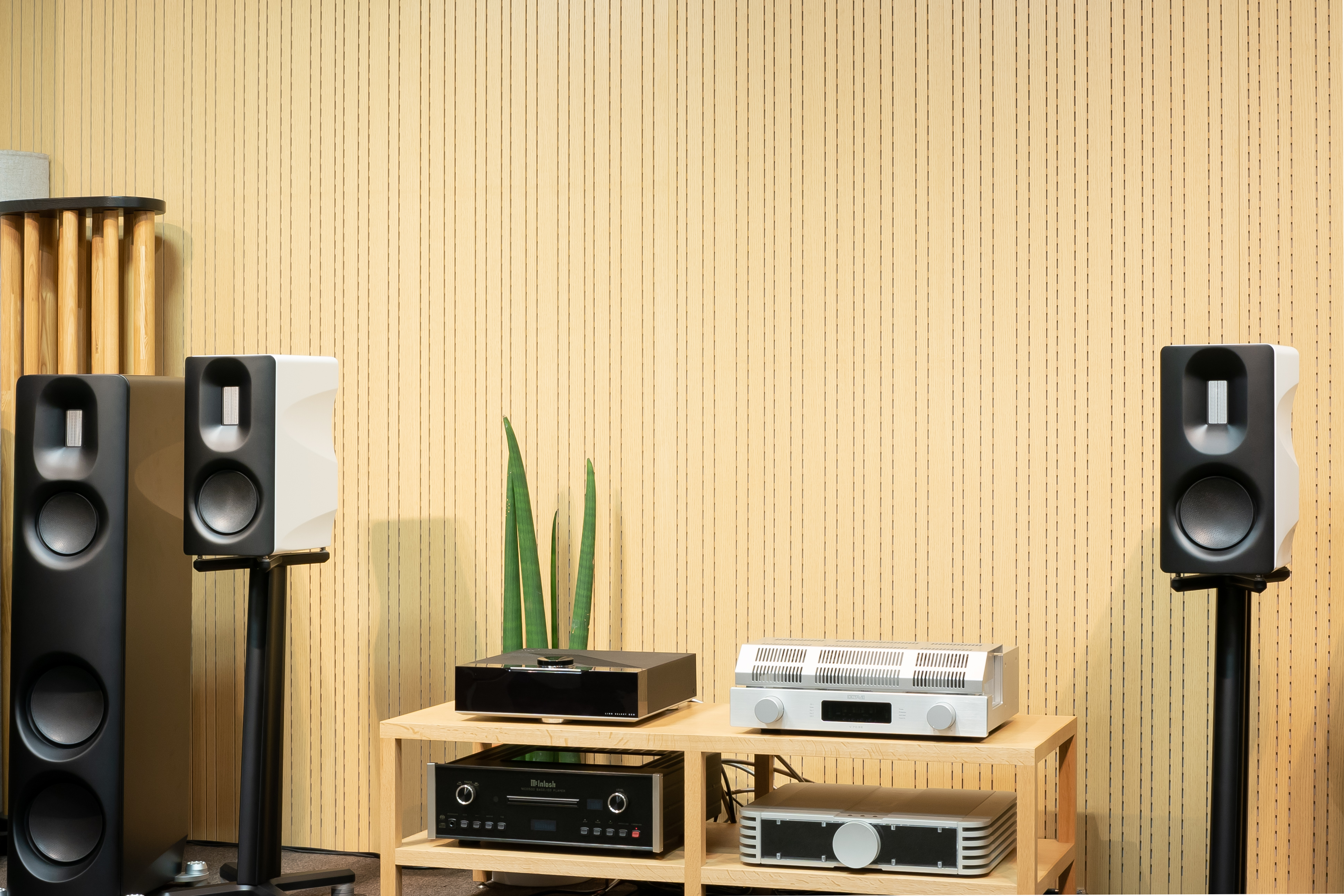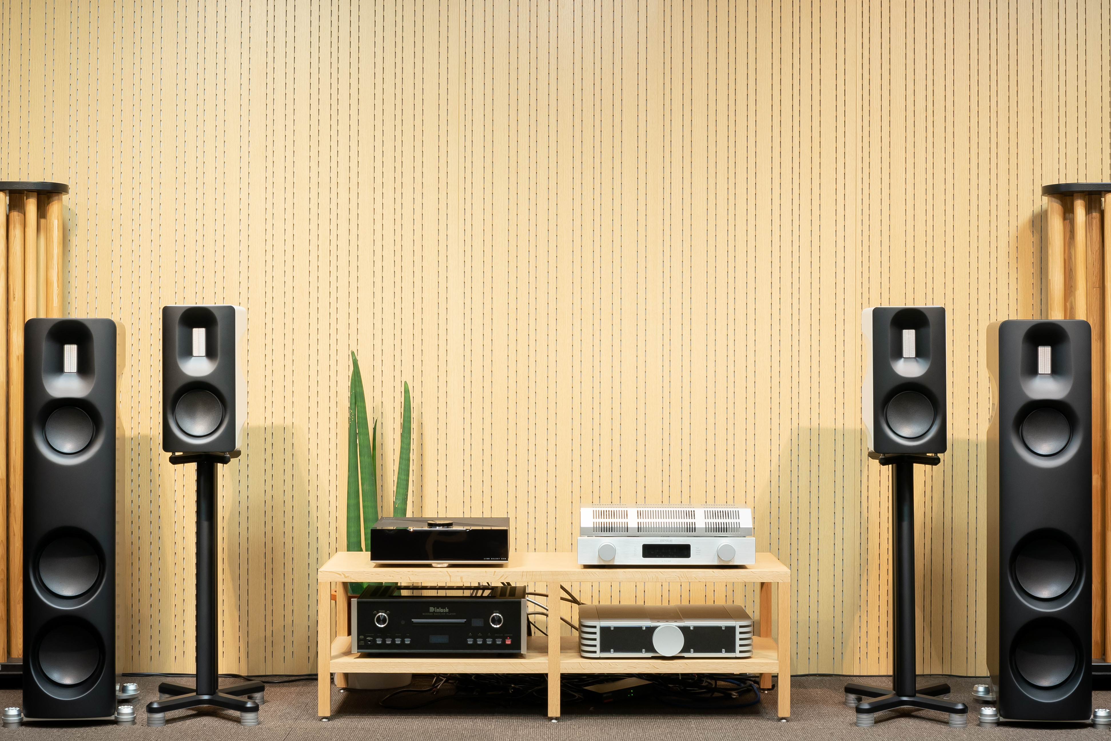 インシュレーターに Ansuz Darkz (dtc) を使用して設置するとフロアーモデルより少し背が高くなり、無しの状態ではほぼ同じ高さ。それにしても広域の伸び具合、中低域の反応の良さなどはブックシェルフサイズでの音場とは思えないくらい心地良く豊かで深い世界を魅せてくれます。デモ再生の環境は LINN SELEKT DSM-KA、Aavik U-150、OCTAVE V-70SE、3機種のプリメインアンプのご用意がありますのでそれぞれの雰囲気の違いも体験頂けます。