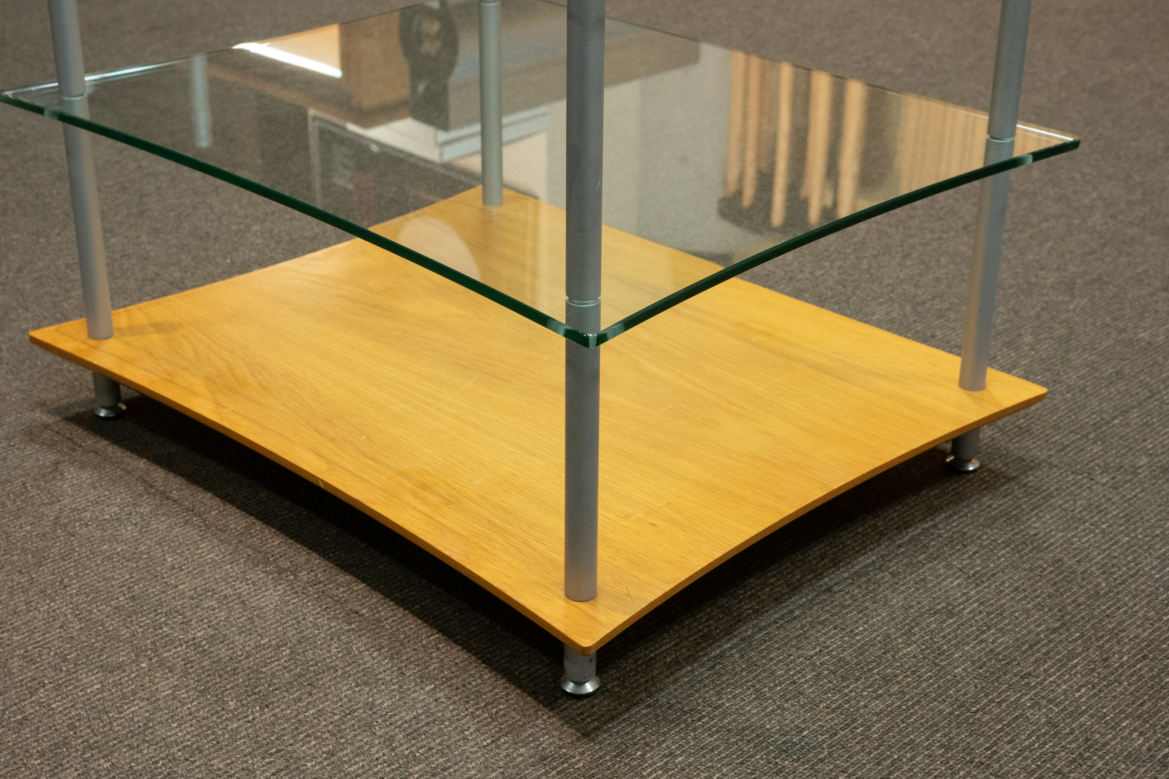 QUADRASPIRE 3段ラックの中古入荷となります。最下段にオーク棚板、中段と上段はガラス棚板の設定、設置する機器が浮いているようでもありラックの存在感が消されるようなレイアウトが演出できます。棚板は入れ替え可能ですのでお好きなレイアウトでご使用ください。多少の使用感はありますが大きな傷もなく、コンディション良好です。