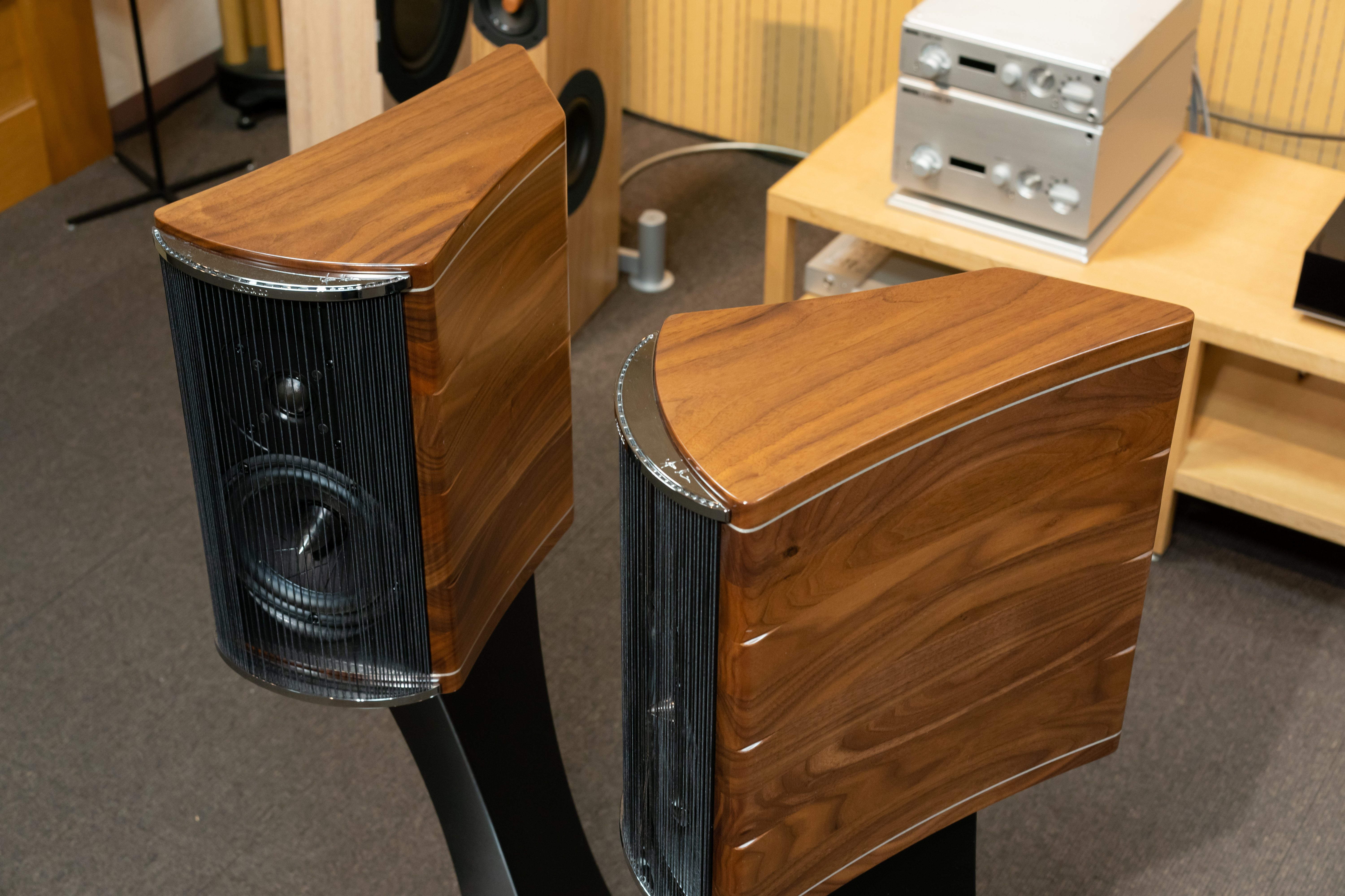 イタリアのスピーカーメーカー Sonus faber の創業者フランコ・セルブリン製作のスピーカー、Accordo。フロアーモデル Ktema と同様のキャビネットデザイン手法をとり、ブックシェルフサイズのキャビネット容量を最大限に活かす為、ネットワークを専用スタンドに格納するなどスピーカー制作における長い経験が様々に落とし込まれた製品。佇まいの美しさと再生の音がこれほど調和するスピーカーは他に似たものがない唯一の存在。コンディション良好です。