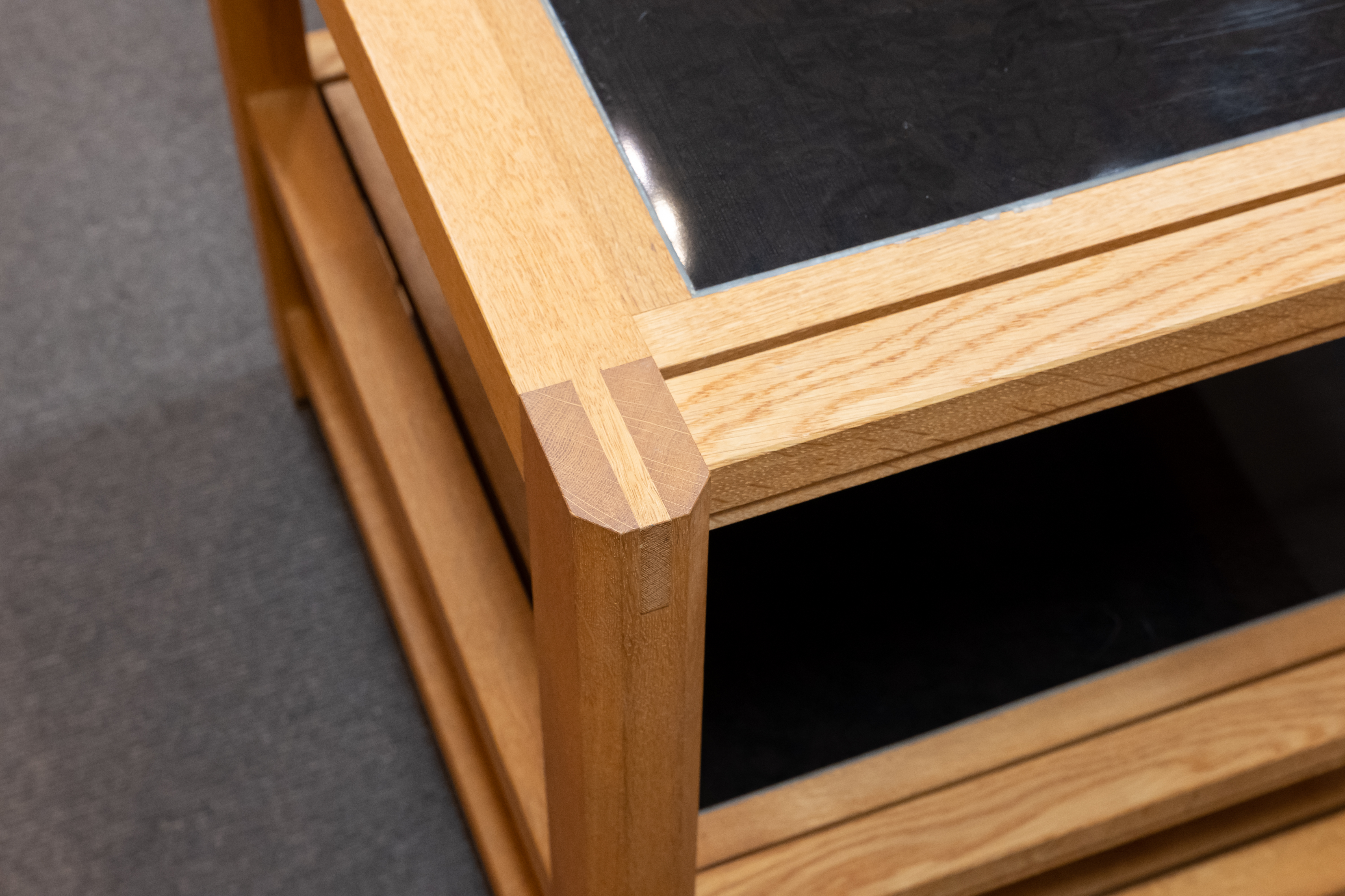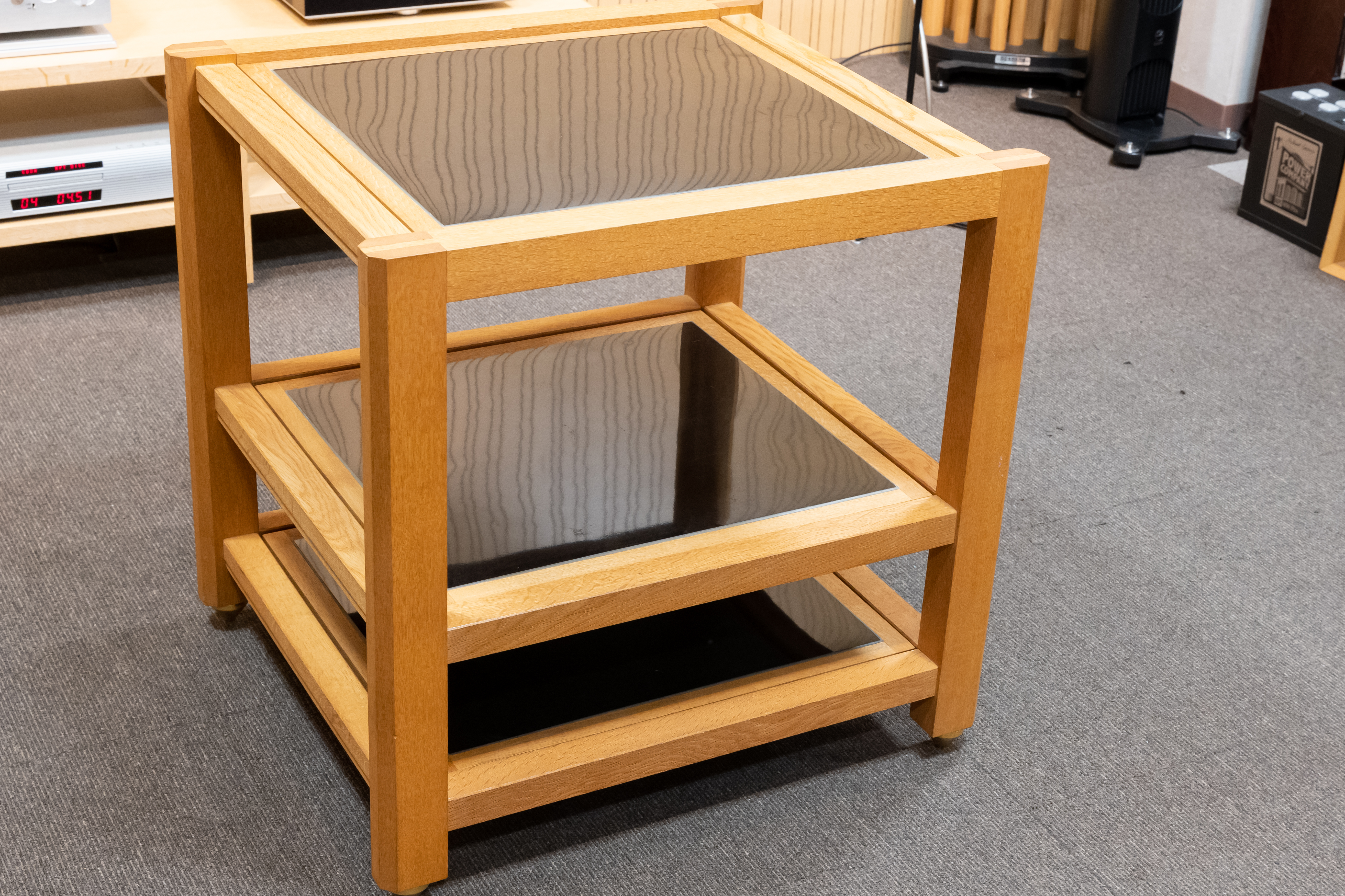 無垢材を採用し釘や接着剤を使用せず、伝統的な木組みにより強固に仕上げたオーディオラック。独自の振動処理に基づいて製作されたオーディオボードはフレームに取り付けられた3mm厚のステンレスプレートで支えられ、設置機器への振動対策と合わせてラック自体の強度も高めています。脚は真鍮製のスパイクを使用して点支持での設置が可能です。使用における小さな傷はありますが、目立つ大きな傷もなく中古品としては良好とお伝えできる範囲です。経年による無垢材の良い雰囲気が出ているかと思います。