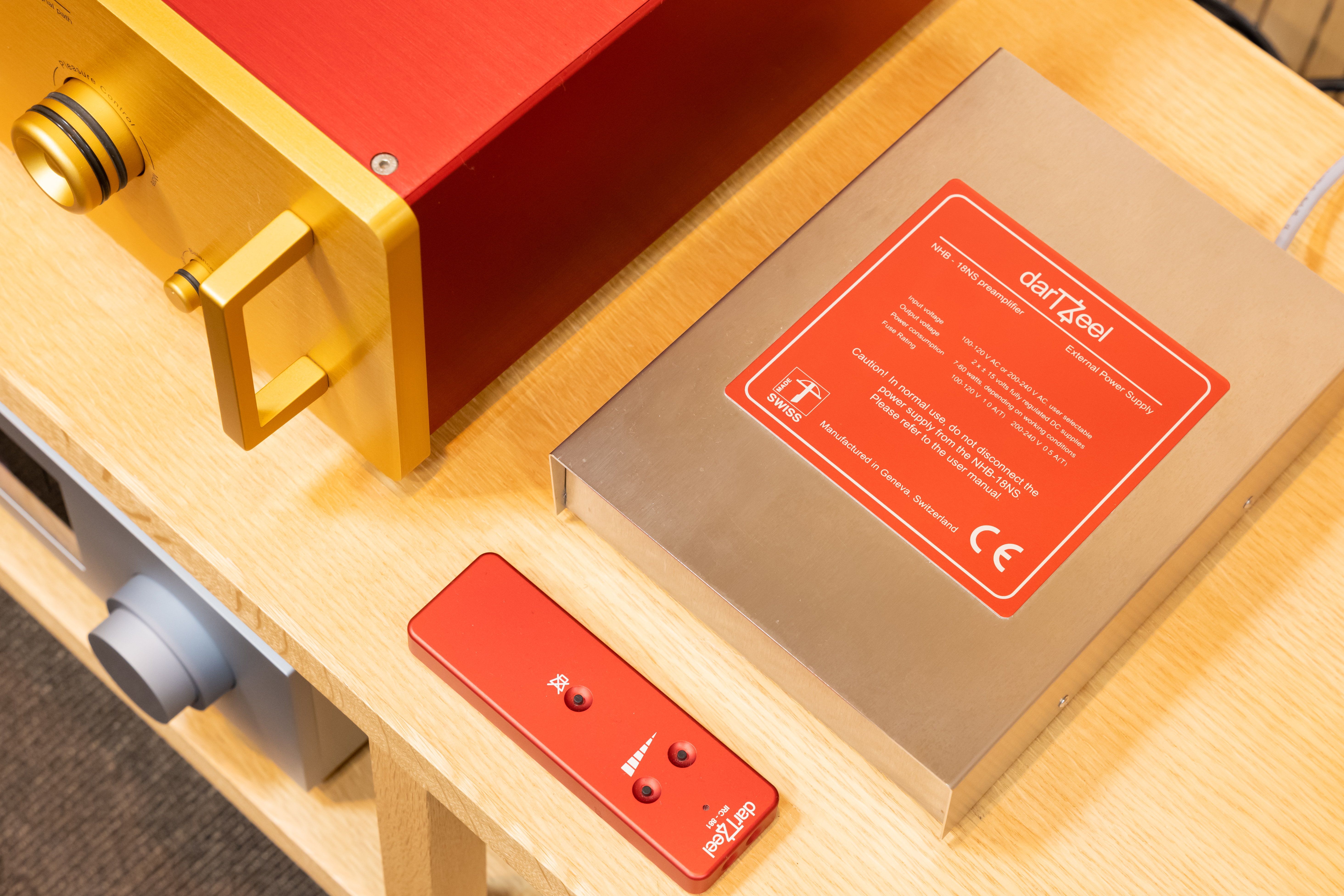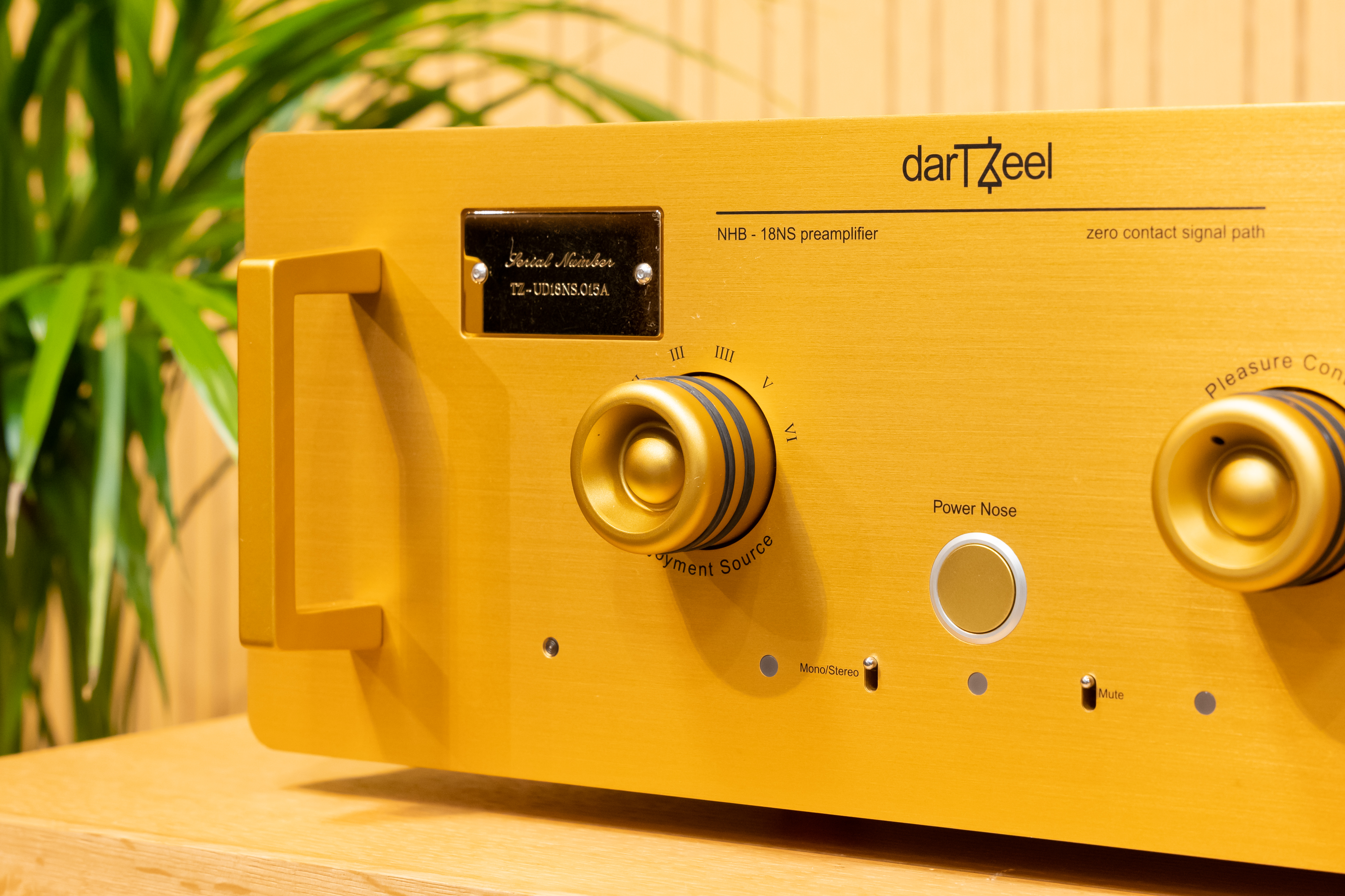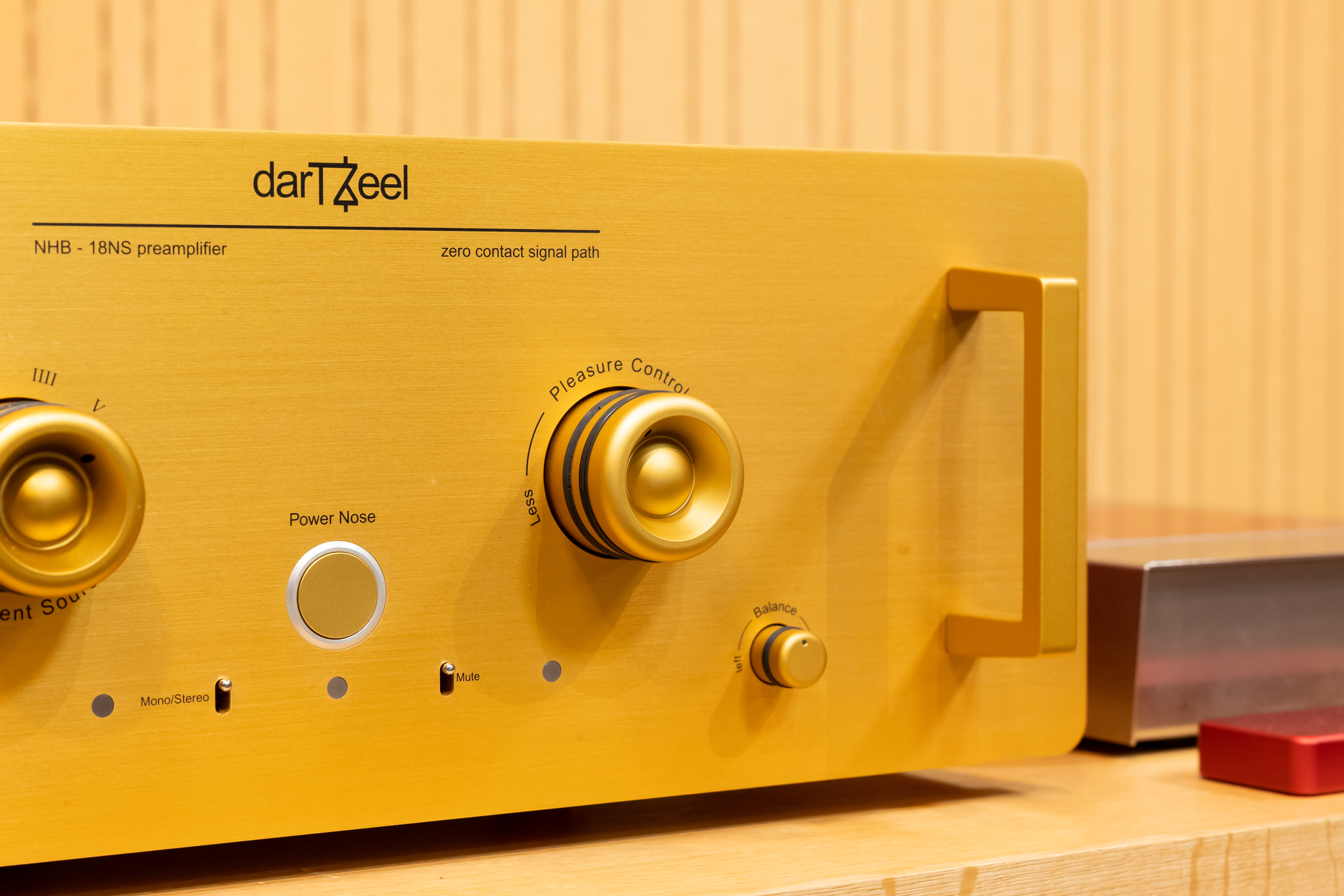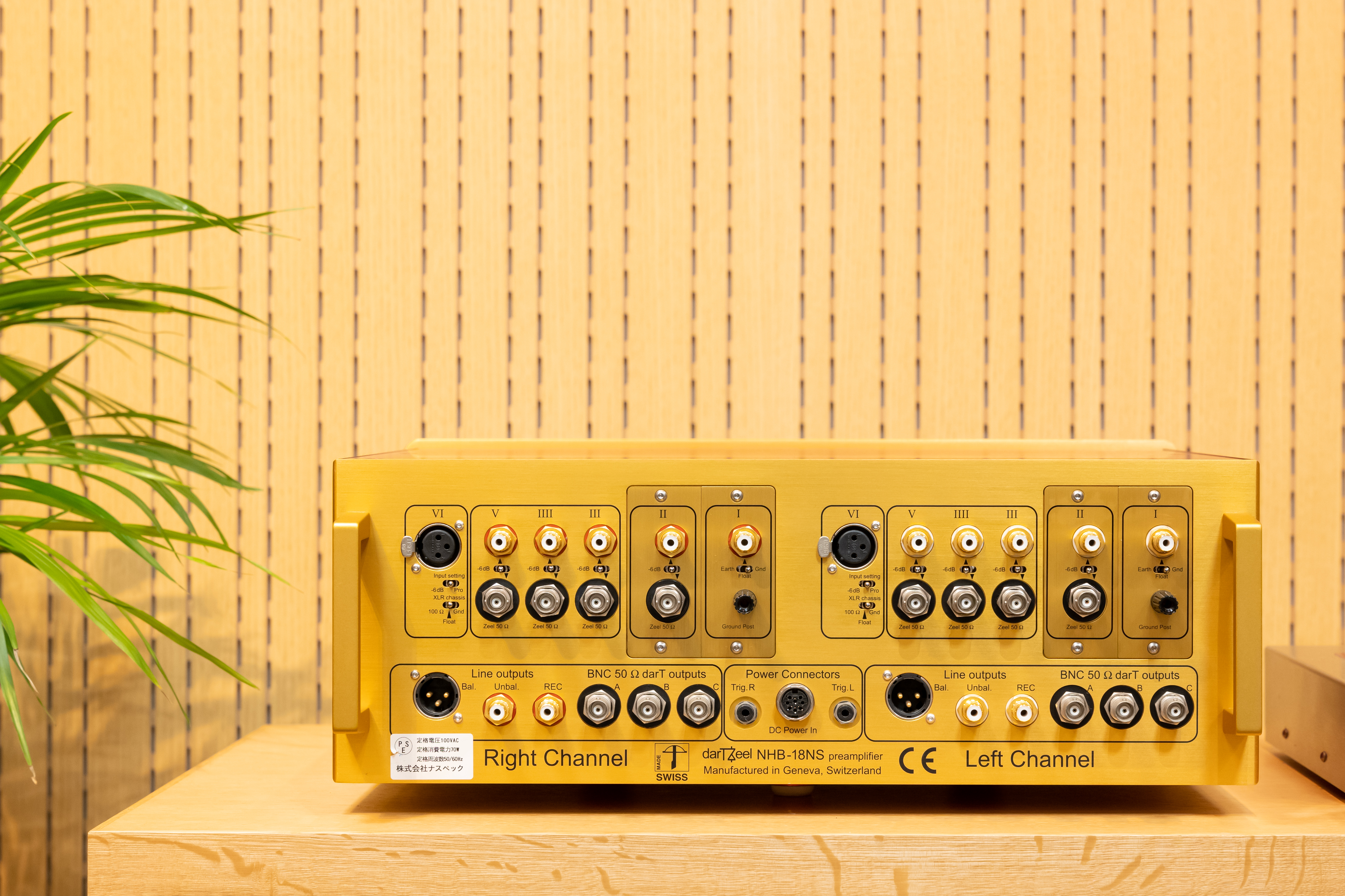 型式のNSはNo Switch(ノー・スイッチ)の略となり、NHB-18 NSは音質を最優先する為、オーディオ史上初のシグナルパス上にどんなスイッチも使われていない回路です。入力切り替えや音量調節の回路も、ポテンショメーター、抵抗、ラダー抵抗、リレー、VCA等使用されておりません。したがって、ボリュームの感触・位置等、今までに無い感覚に出来上がっています。またバッテリー駆動方式によりトランスを使用しておらず、内部の電磁波を発生させない設計です。それぞれの人力ソース毎に入力から出力までゲイン11dBで7個の半導体を使用した増幅器通るだけ、フォノEQアンプ部はゲイン66dBでありながらわずか6個の増幅器を通るだけの完全ディスクリート構成。すべてのシグナルパスにOPアンプは使用されていません。それぞれの入力毎にゲインを持たせ、その出力を切替え、その後ボリュームを調節する回路構成になっています。音量調節回路もアナログ回路でありながら、ポテンショメーターや抵抗の切替式のボリューム、VCAで無く、ロータリースイッチやリレーなども一切使用しておりません。この事によりロータリースイッチやリレーを使用する場合に比べて、非常に透明感のある音が得られます。