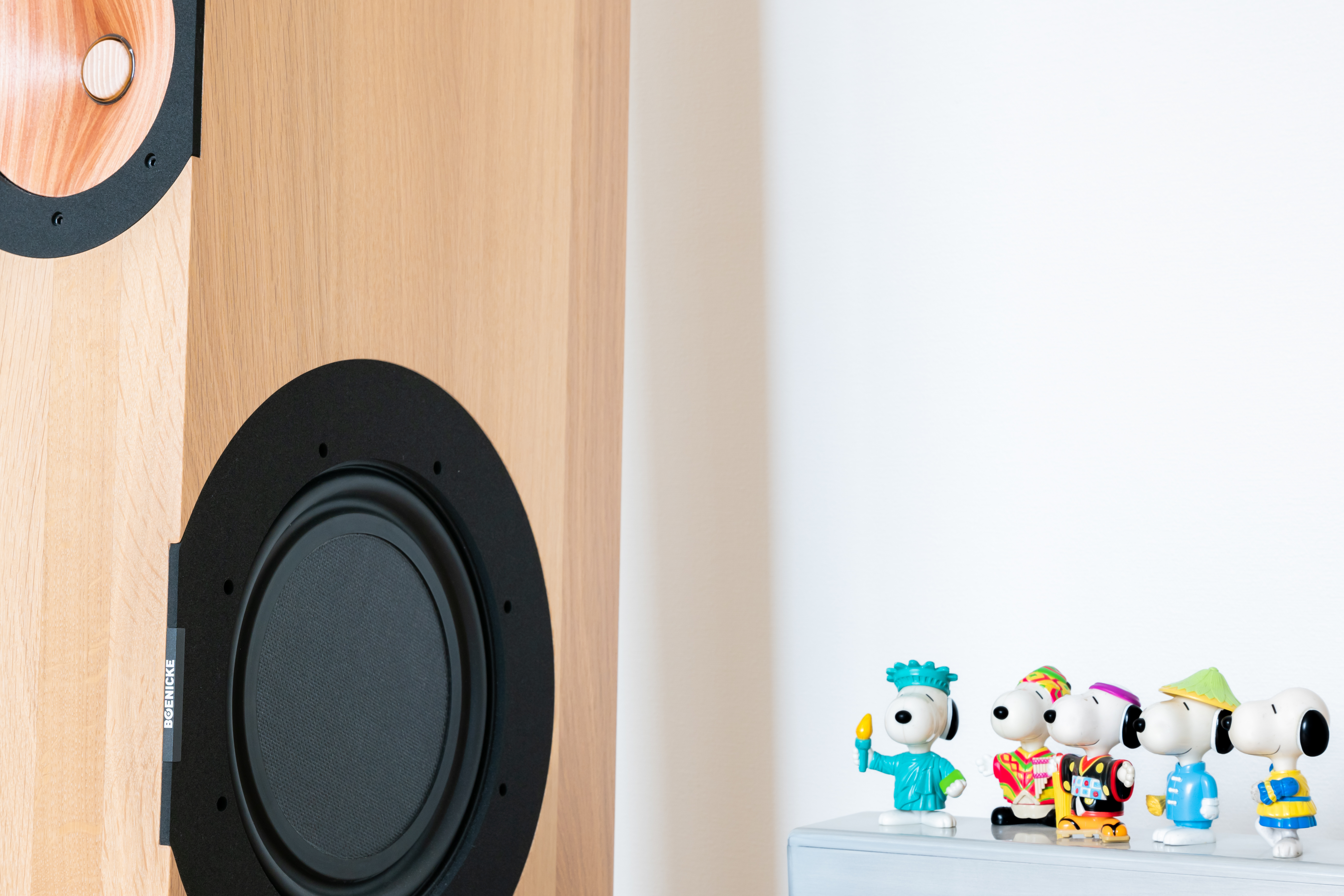 そして W8 より更に大きいフロアーモデル、BOENICKE Audio では最も大きなサイズとなる W11 ですが、このサイズでようやく他社の通常サイズ、もしくはミドルサイズと言えるかも知れません。中高域ユニットに合わせたフロントバッフルのサイズがスピーカーの存在を消すような佇まいを持ち、ウーファーユニットは面積の大きなサイドスペースを活用して全帯域のバランスを非常に上手く整えています。このキャビネット設計は W5、W8、W11 全てに共通していますが、正面から見るスピーカーに対するストレスの少なさは再生時の音への集中度が高くなり、また存在の美しさも共存させています。W11 に特徴的なウッドコーンユニットは、カーボン素材を使用したフラットウーファーユニットの贅沢で伸びやかな低域と見事にマッチします。また W11 には低域が5段階で調整可能です、設置環境、ユーザーの好みにより調整幅が設けられていることの自由度は嬉しい内容です。加えて、キャビネット背面にアンビエントツィーターを装備する事もラインアップ全てに共通する仕様として手の込んだ作り込みとなっています。