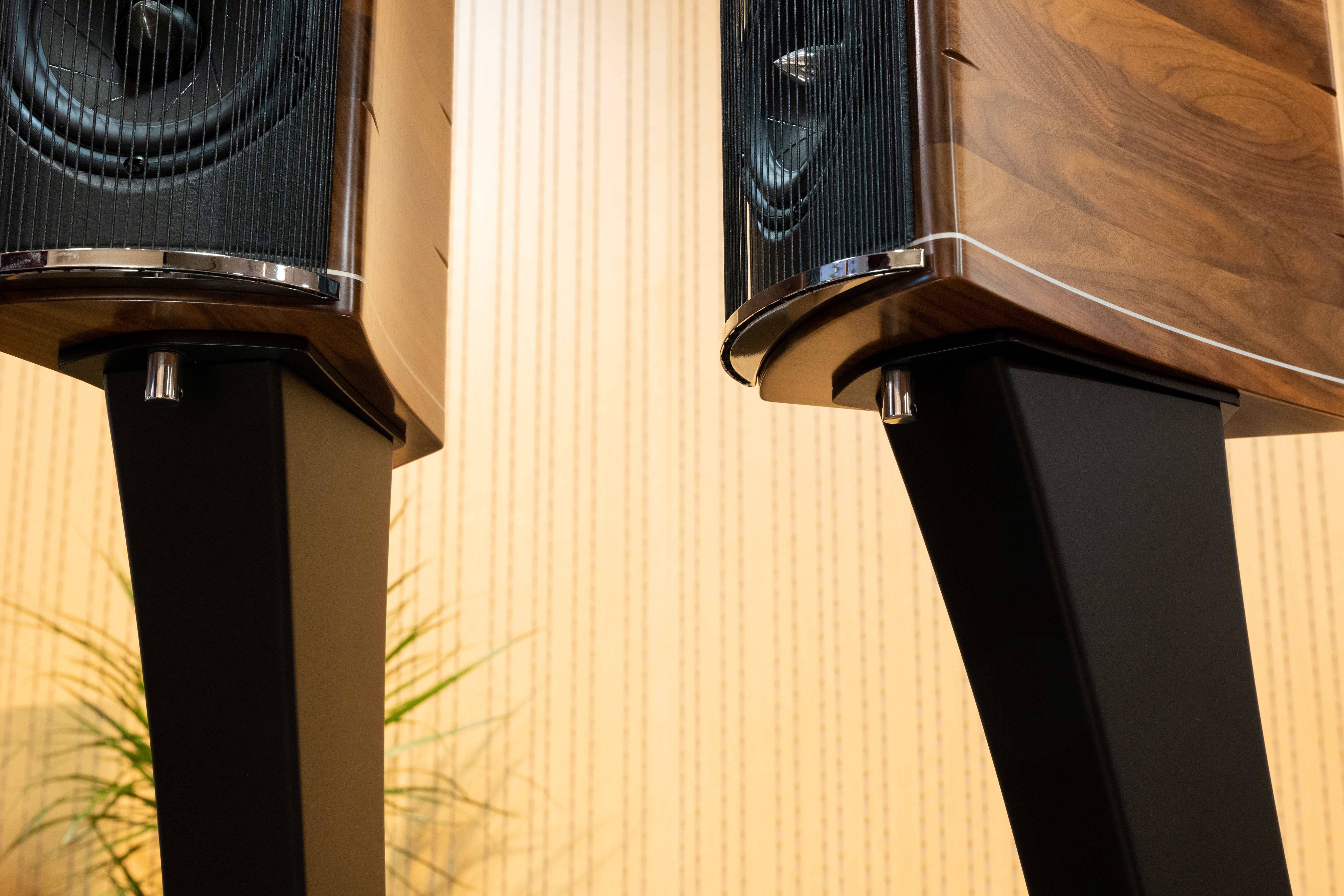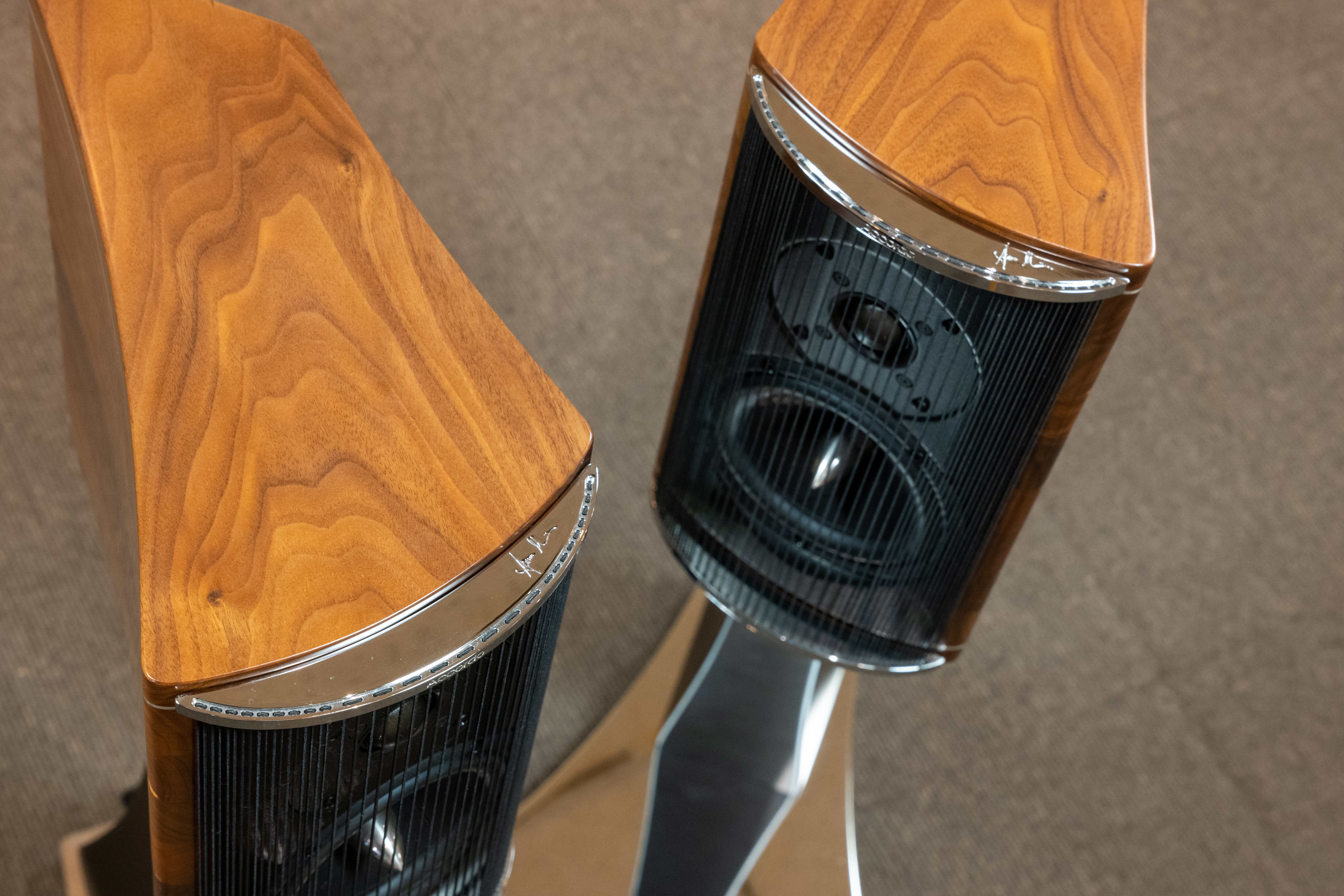 イタリアのスピーカーメーカー Sonus faber の創業者フランコ・セルブリン製作のスピーカー、Accordo。フロアーモデル Ktema と同様のキャビネットデザイン手法をとり、ブックシェルフサイズのキャビネット容量を最大限に活かす為、ネットワークを専用スタンドに格納するなどスピーカー制作における長い経験が様々に落とし込まれた製品。佇まいの美しさと再生の音がこれほど調和するスピーカーは他に似たものがない唯一の存在。コンディション良好です。