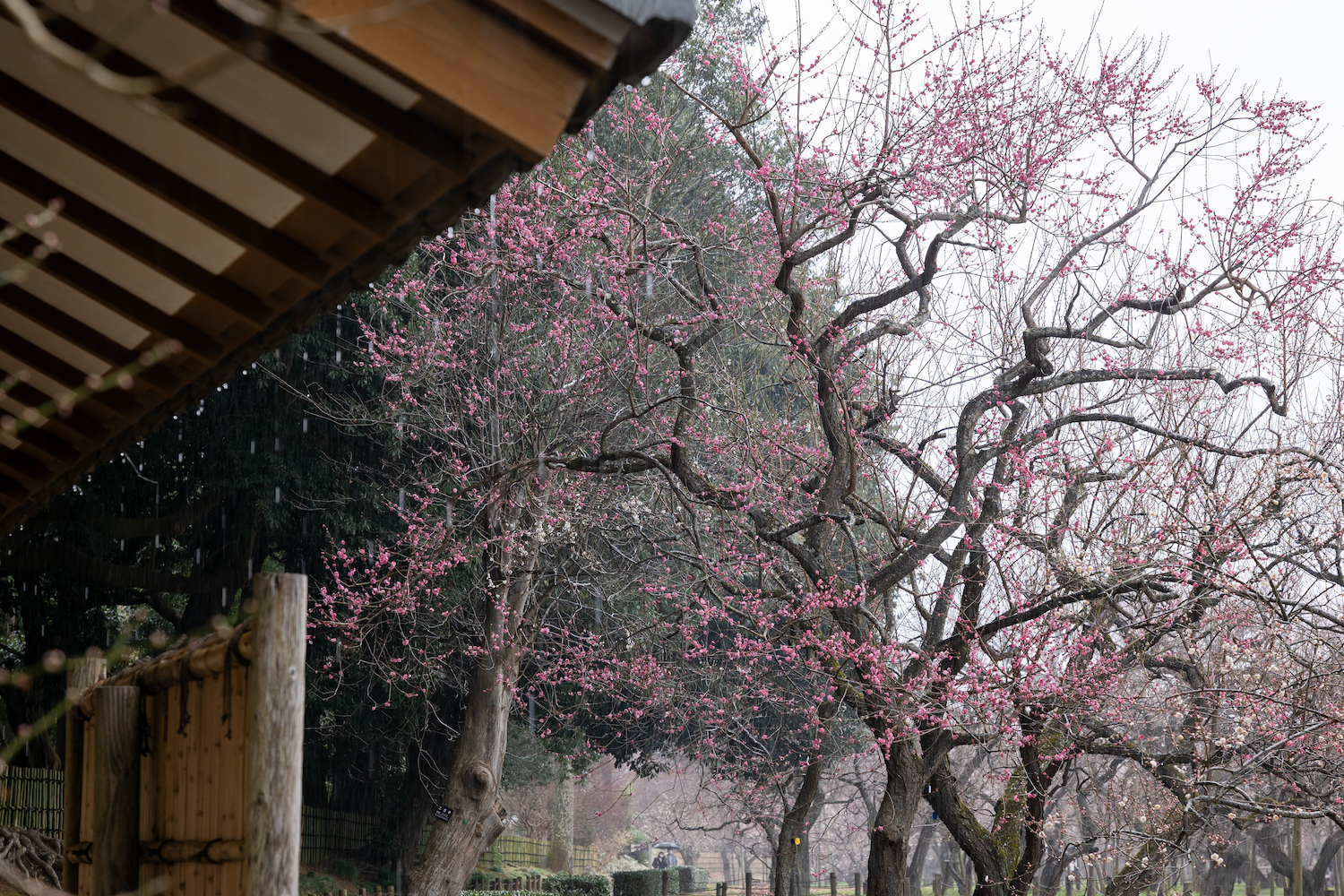 車で10分ほど走ると偕楽園の梅まつり、お客様宅からの移動を始めた頃には空の様子が怪しい雰囲気でポツポツと雨の落ちる様子に。偕楽園の駐車場に着いた頃には雨足が強くなり、これは残念だけど諦めようかなとも思いましたが、せっかくここまで来たのだしという事で傘を買って散策することに。幸い雨のお陰で来場者も少なく、ひとつひとつ名前の付いた梅の木を見て進みながら、広大な敷地がほとんど貸切状態。こうなると雨の音もなんだか心地良くなってくるものですね、咲き始めたものやこれからしっかりと咲くであろう蕾を眺めながらのんびりできました。傘を差しながらカメラを持つのはなかなか難しいという経験もできましたし、また今度は晴れの日にも立ち寄ってみたいと思える素敵な場所でした。有難うございました。