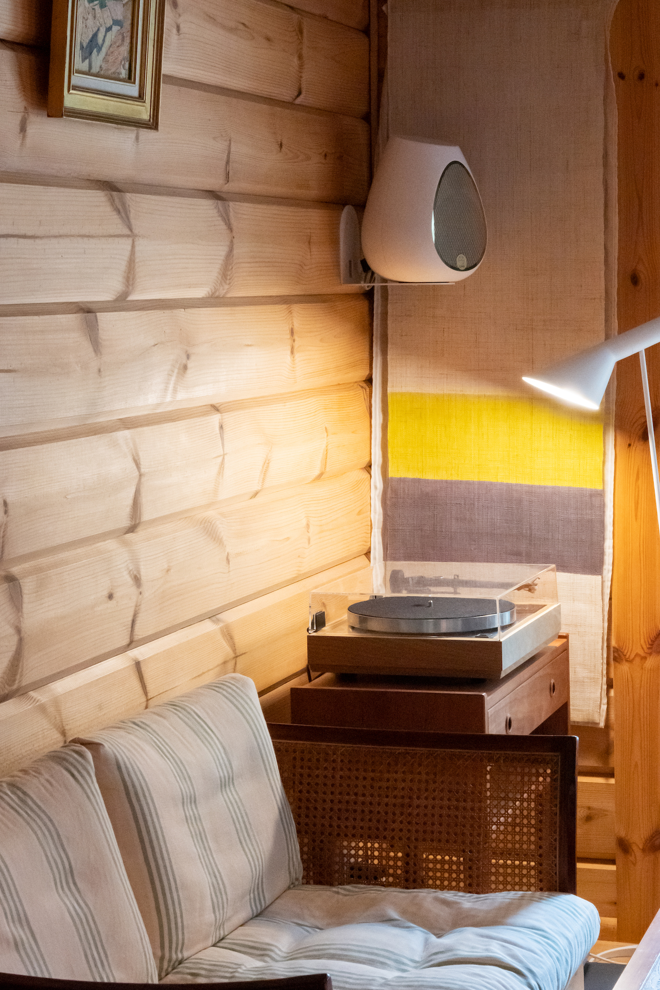 何度お邪魔しても素敵な空間に心が穏やかになります。天井も高く、ログハウスの香りと響きはそれだけで音楽や映像再生の素晴らしい聴き心地を確保してくれます。「この部屋の響きならブックシェルフの EXAKT AKUDORIK で十分なパフォーマンスをしてくれると思ったんです。」というお客様の読み通り、広いスペースではありますがこのサイズのスピーカーでもたっぷりと空間を音で満たしてくれます。EXAKT AKUDORIK というシステムであることもこの場所での高い音質を聴かせてくれる重要な選択だったと思います。今回はリアスピーカーを302に変更して EXAKT 4chサラウンドとしてお楽しみ頂くために設置作業を始めます。フロントからの EXAKT Link ケーブルも配線を改めて引き直しながら背面へSeries 3専用壁付けブラケットを取り付けます、Series 3 は7kg弱の重量があるため壁取り付けの際は十分な強度が必要です。今回のお客様のご環境はログハウスのため壁の強度は十分にあり、補強無しでスムーズにブラケットを取り付ける事ができます。専用ブラケットは左右30°ずつの角度調整も可能、今回もリスニングポジションに合わせて角度調整しています。冒頭で 302 がピッタリだと直ぐに思ったのはこういう理由もあったのです。
