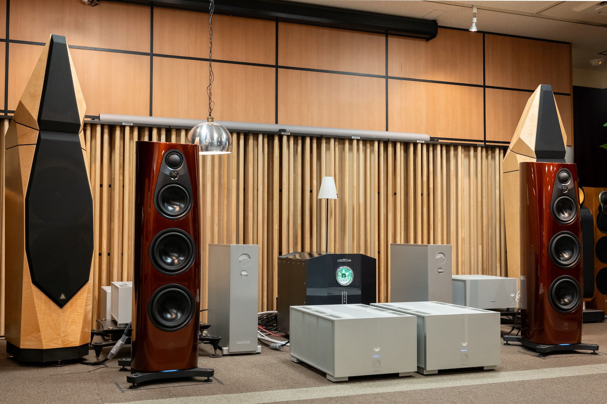 フロアー正面には現在 LINN 360 PWAB、AVALON SAGA という2setのスピーカーを設定しています。特に大柄の SAGA についてはシステムによって常にウーファーの動きを気にしますが、組み合わせるアンプによってはボトムの緩さに気を落としてしまうこともあり、スピーカーとアンプのバランスには注意が必要。LINN 360 PWAB は Passive with Activ Bass の通り最低音域をアクティブ駆動します。こちらも新製品として昨年に届いて以降、ゆっくりとフロアーでエージングを進めているスピーカーですが、アクティブ駆動する低域用のふたつのウーファーユニットをどれだけ瞬間的に動かせるか。これはアンプとの組み合わせで大きく変化します。