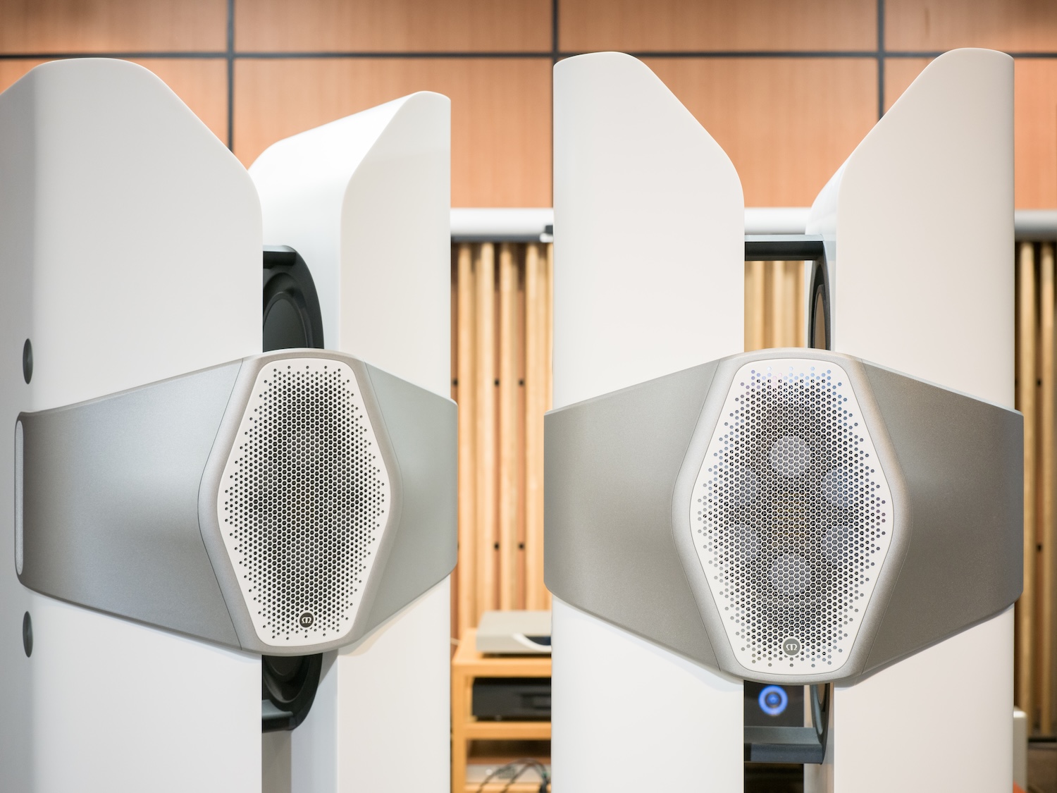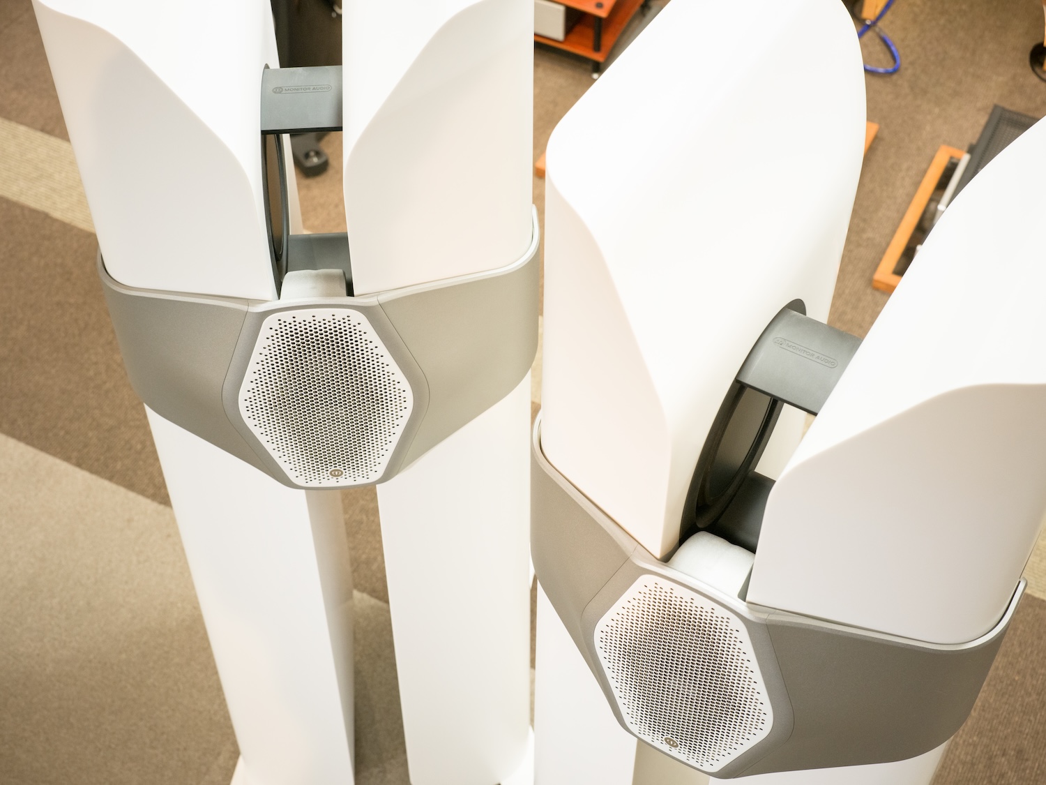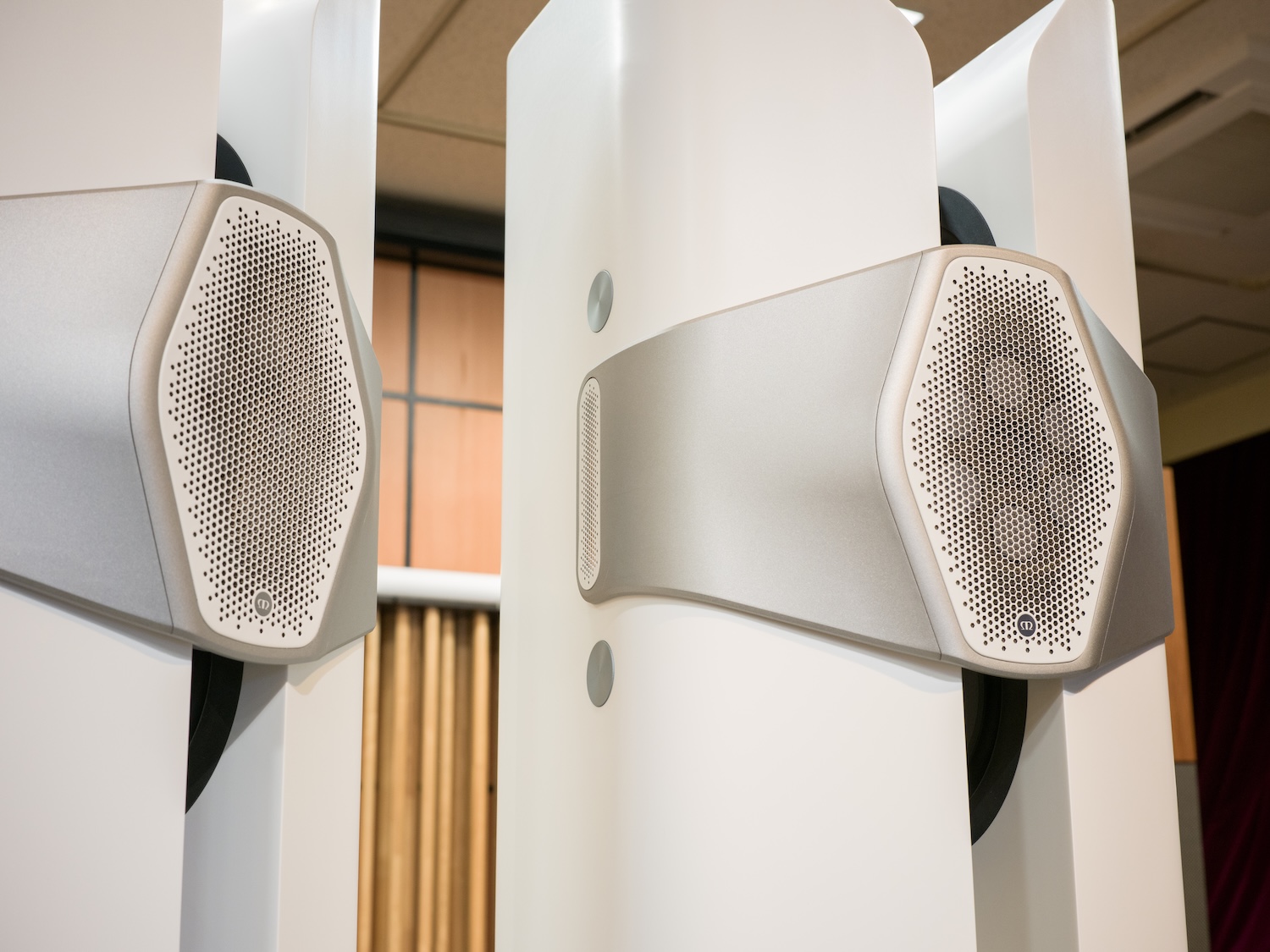 Monitor Audio 50周年記念モデル。中央のハイル・ドライバーを囲むように近接配置された6基のミッドユニット、キャビネット内側に設置された左右各二基のウーファーによる3way、11スピーカー。アクリル、鉱物、天然顔料を組み合わせた複合材料のキャビネットも含め、職人の手作業による Made in Britain。
