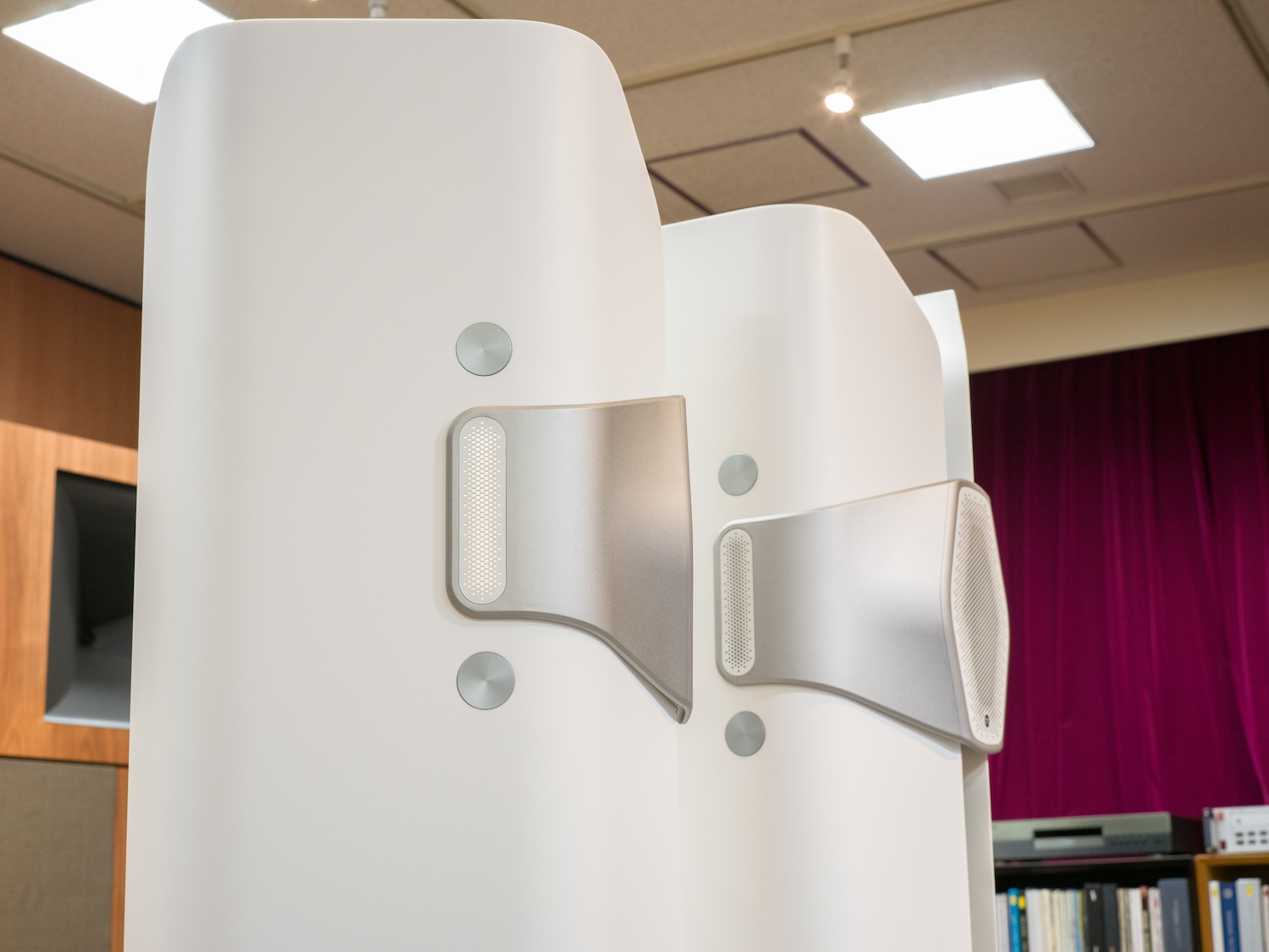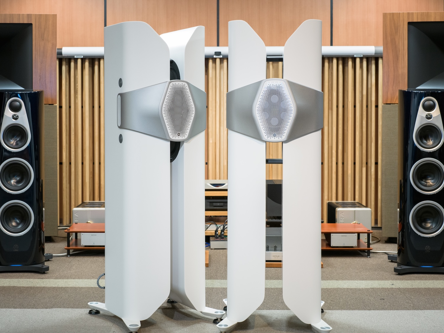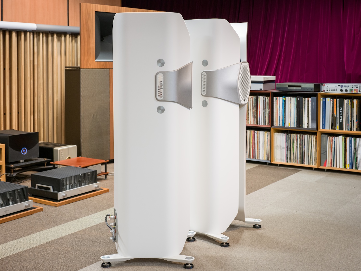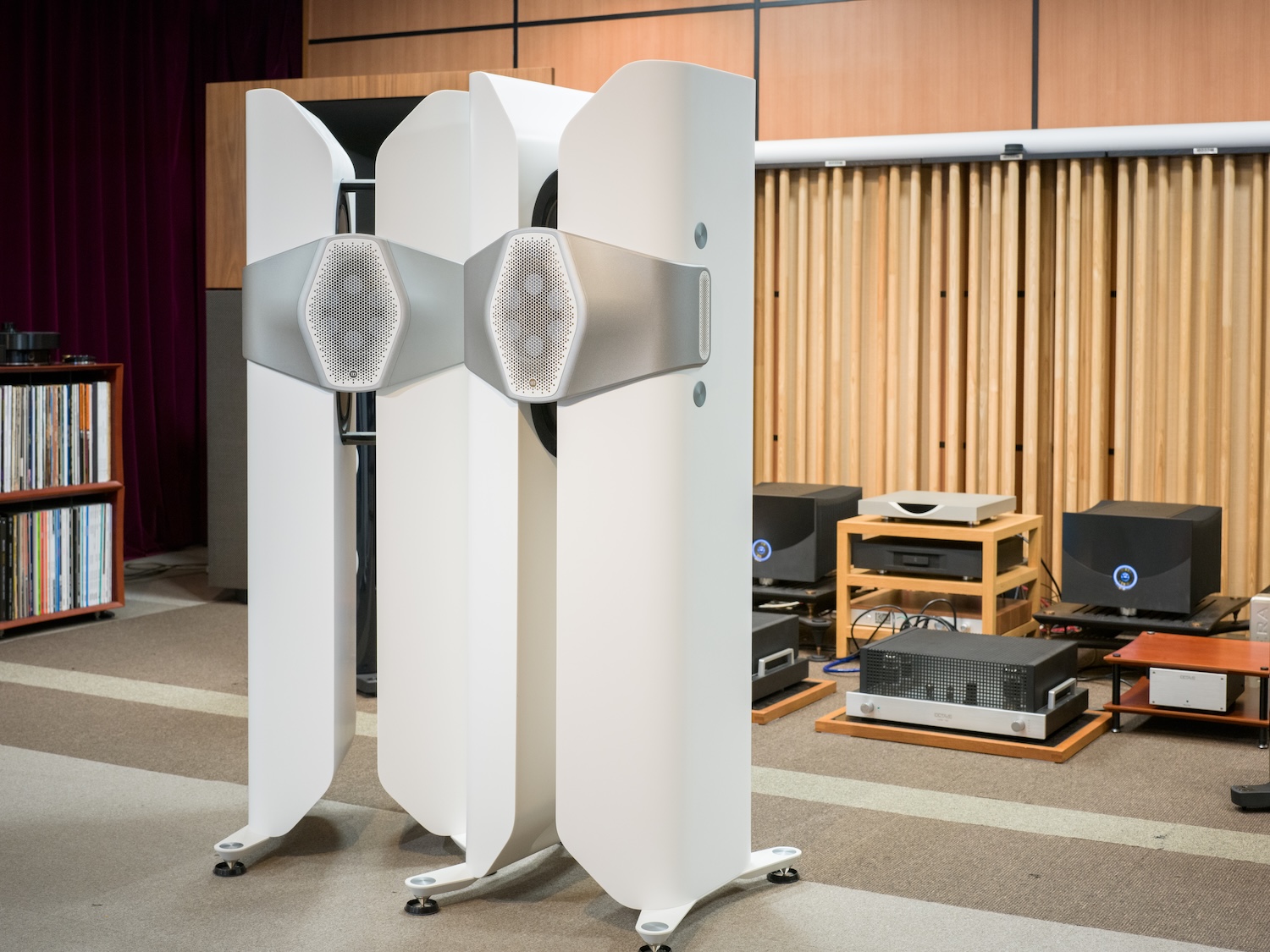 Monitor Audio 50周年記念モデル。中央のハイル・ドライバーを囲むように近接配置された6基のミッドユニット、キャビネット内側に設置された左右各二基のウーファーによる3way、11スピーカー。アクリル、鉱物、天然顔料を組み合わせた複合材料のキャビネットも含め、職人の手作業による Made in Britain。