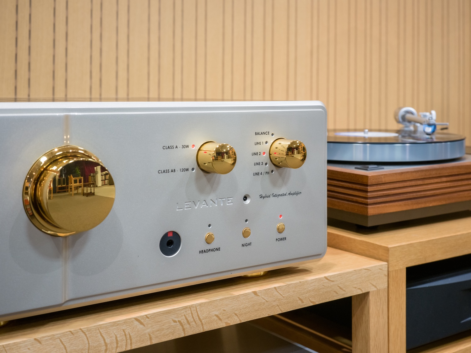 RIVIERA からインテグレーテッドアンプ LEVANTE が国内発売されました。純A級動作、三極真空管+ソリッドステートのハイブリッド構造、ゼロフィードバックというコンセプトは上位機種と同様です。LEVANTE ではフロントのツマミで純A級(出力30W)とAB級(出力120W)を再生中でも切り替えて楽しむ事ができます。セパレートアンプ再生時のように純A級(出力30W)でもドライブ能力に心配はありませんが、一筐体で仕上げる製品の為、組み合わせるスピーカーを幅広く想定し再生できるよう考えたものだと思います。AB級での再生も清々しく心地良いですが、RIVIERA の魅力を深く味わうとすればA級での再生時間が長くなります。